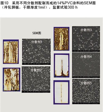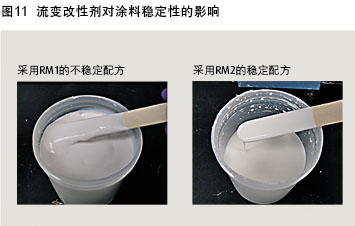 例如,在研磨料中加入五種不同的分散劑進(jìn)行試驗(yàn)評(píng)估,發(fā)現(xiàn)涂料的防腐性出現(xiàn)截然不同的結(jié)果(圖9)。為了深入了解這一結(jié)果的原因,采用SEM分析對(duì)涂料進(jìn)行評(píng)估(圖10),結(jié)果令人震驚。當(dāng)分散劑的疏水性越強(qiáng)時(shí),二氧化鈦在醇酸樹脂涂料中的分散越好,從而防腐性能更好。因此必須選擇恰當(dāng)?shù)闹鷦@對(duì)其他助劑,包括流變改性劑(RM)和消泡劑,也是一樣的。圖11顯示了RM1是如何導(dǎo)致了一個(gè)不穩(wěn)定的涂料配方,而RM2能使涂料增稠,達(dá)到一定的黏度,而不會(huì)出現(xiàn)絮凝結(jié)塊。