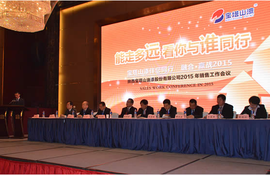 會(huì)議首先由寶塔山漆總經(jīng)理助理李斌代表公司向大會(huì)做主題為“能走多遠(yuǎn) 看你與誰(shuí)同行”的寶塔山漆2014年工作報(bào)告及2015年工作規(guī)劃。報(bào)告中指出寶塔山漆在2014年通過(guò)不斷內(nèi)部自我調(diào)整和外部專業(yè)指導(dǎo),努力適應(yīng)新常態(tài),在新常態(tài)中探尋適合企業(yè)發(fā)展的路徑,并通過(guò)業(yè)績(jī)、品牌、開(kāi)發(fā)、結(jié)構(gòu)、服務(wù)、研發(fā)、建設(shè)7個(gè)關(guān)鍵詞梳理了寶塔山漆2014年全年的工作思路。2014年寶塔山公司共完成涂料產(chǎn)品銷售4萬(wàn)余噸,比上年同期增長(zhǎng)1千噸,實(shí)現(xiàn)銷售額4.22億元,上交稅金3 000余萬(wàn)元。寶塔山漆加強(qiáng)推進(jìn)品牌建設(shè)力度,促進(jìn)企業(yè)不斷發(fā)展壯大,2014年被陜西省工業(yè)和信息化廳認(rèn)定為“工業(yè)品牌培育示范企業(yè)”,并大力開(kāi)發(fā)利用微博、微信、電子商務(wù)平臺(tái)等新的品牌宣傳渠道,有力地提升了寶塔山漆在終端消費(fèi)市場(chǎng)的知名度。此外,2014年寶塔山漆在工程工業(yè)客戶的開(kāi)發(fā)方面卓有成效,拓展了車輛改裝、鋼結(jié)構(gòu)、重型機(jī)械制造、建筑內(nèi)外墻等終端領(lǐng)域,并對(duì)經(jīng)銷商、代理商和加盟商進(jìn)行了深掘挖潛,得到了市場(chǎng)的廣泛認(rèn)可。公司市場(chǎng)結(jié)構(gòu)調(diào)整和產(chǎn)品結(jié)構(gòu)調(diào)整順應(yīng)了國(guó)家經(jīng)濟(jì)結(jié)構(gòu)調(diào)整的步伐,各大品類均有了不同程度的增長(zhǎng),尤其在水性涂料方面實(shí)現(xiàn)了跨越式增長(zhǎng),與上年同比增長(zhǎng)30%,真石漆、多彩漆、刮砂漆等方面也均有突破。2014年初根據(jù)公司產(chǎn)品戰(zhàn)略規(guī)劃,投資200萬(wàn)元建設(shè)了西北地區(qū)最大的藝術(shù)涂料生產(chǎn)線,以滿足市場(chǎng)需求。