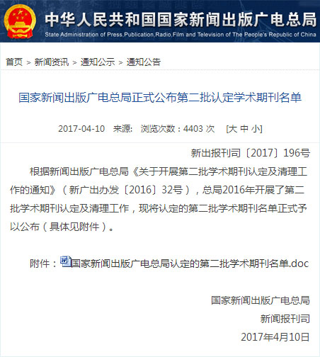 國家新聞出版廣電總局正式公布第二批認定學術期刊名單