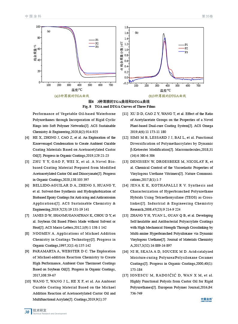 摘要:介紹了一種無溶劑法制備菜籽油基邁克爾加成涂層,以菜籽油、2–巰基乙醇、乙酰乙酸叔丁酯為原料,通過巰基“點擊”反應和酯交換反應制備乙酰乙酸酯菜籽油,并和多官能度丙烯酸酯反應(Michael加成反應)制備涂層。通過動態(tài)熱機械分析、熱重力分析和差分掃描熱量法,對所得涂層的機械性能和熱力學性能進行研究。結(jié)果表明,隨著涂層交聯(lián)密度的增加,涂層的機械性能、熱穩(wěn)定性增加。