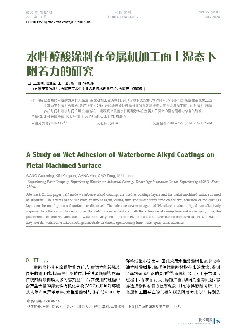 本文系作者@王國明,信雅全,王 巖,高 峰,許利莎 授權中國涂料網發表,并經中國涂料網編輯,未經允許不得轉載,如需轉載請聯系chinacoatingnet@vip.163.com