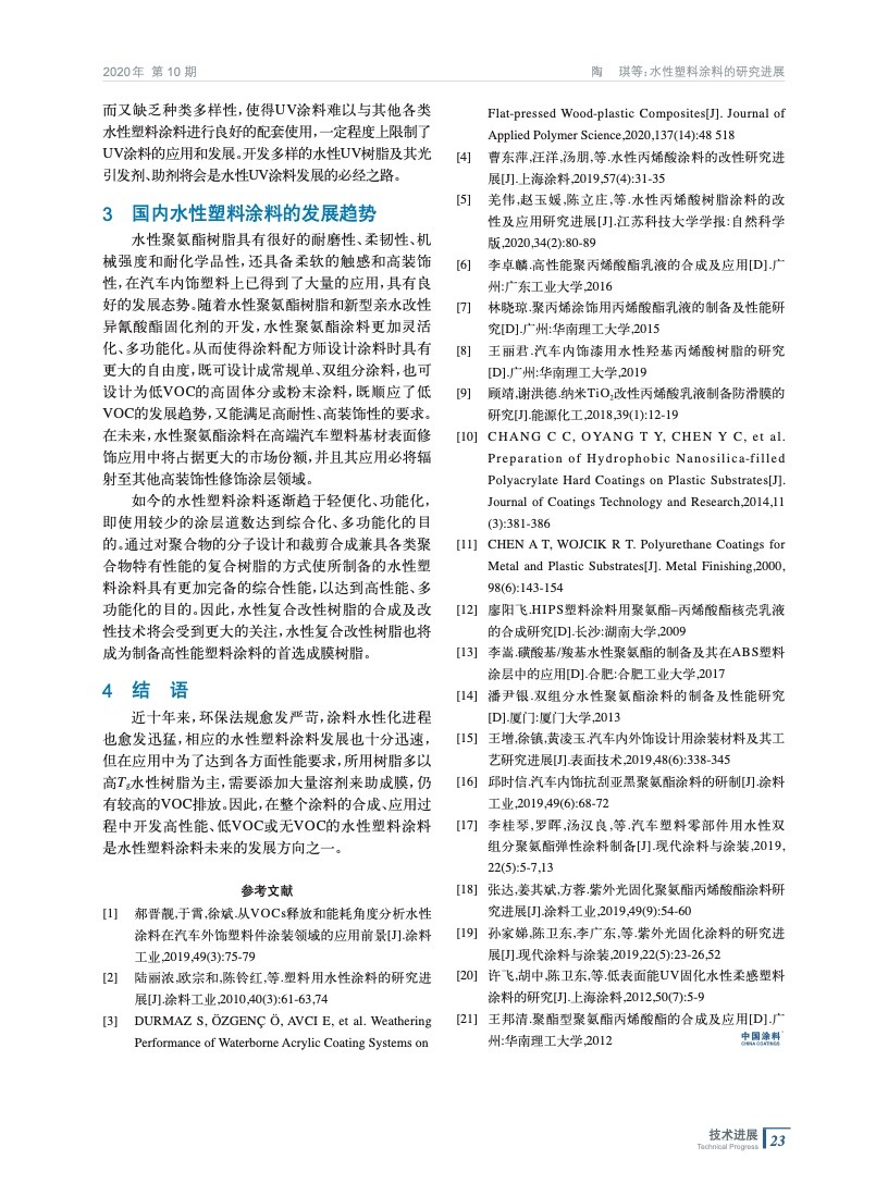 綜述了水性丙烯酸塑料涂料、水性聚氨酯塑料涂料和水性光固化塑料涂料3種低VOC水性塑料涂料的發展現狀及水性塑料涂料樹脂的研究進展;介紹了低VOC水性塑料涂料目前存在的缺陷,并提出了今后的發展趨勢。