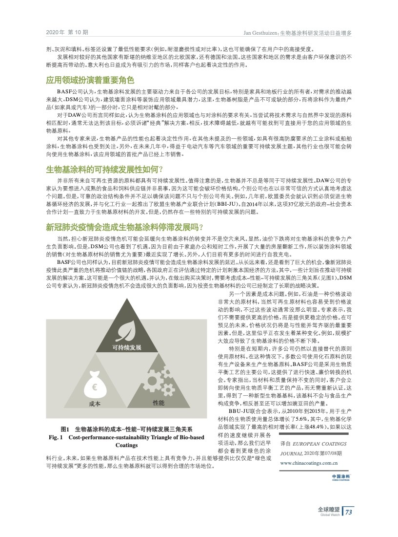 編者按:在全球涂料行業中,生物基涂料仍然發揮著較小的作用。與兩年前一樣,目前的市場份額估計為約占整個涂料市場的5%的銷售額和1%的銷售量。其中,大部分來自長期存在的天然原料。但是,多年來出現了一些新的變化,在歐洲,由于價格較高和需求增加,生物基涂料正變得越來越流行。