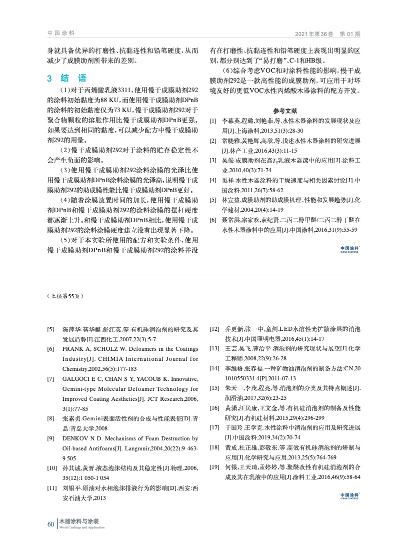 摘要:研究了高沸點成膜助劑在水性丙烯酸木器涂料中的應用,測試結果表明,該成膜助劑對于聚合物顆粒的溶脹作用比DPnB更強,不影響涂料的貯存穩定性,涂膜光澤高,隨放置時間的加長,涂膜的擺桿硬度逐漸上升且涂膜硬度建立沒有出現顯著下降,二者的涂膜在打磨性、抗黏連性和鉛筆硬度上未表現出明顯區別。