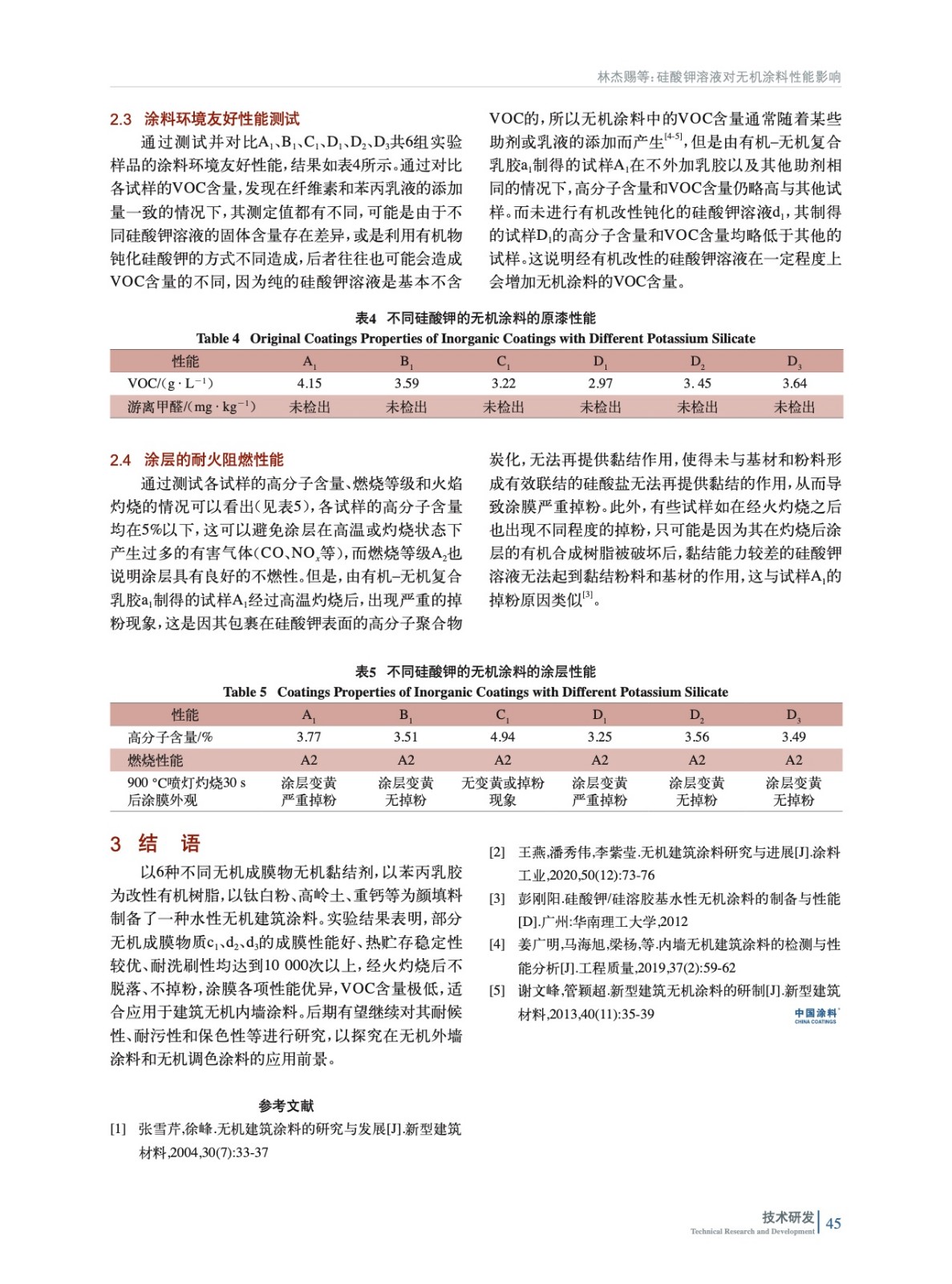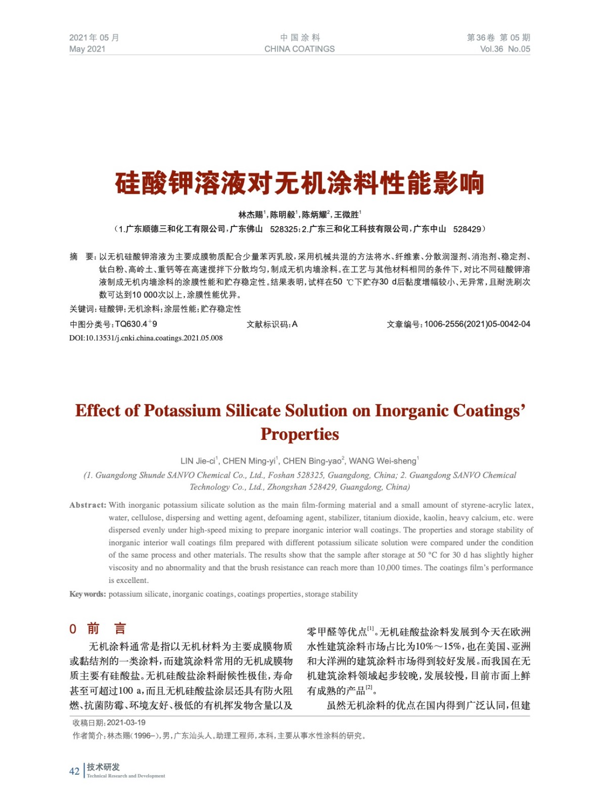 摘要:以無機硅酸鉀溶液為主要成膜物質(zhì)配合少量苯丙乳膠,采用機械共混的方法將水、纖維素、分散潤濕劑、消泡劑、穩(wěn)定劑、鈦白粉、高嶺土、重鈣等在高速攪拌下分散均勻,制成無機內(nèi)墻涂料。在工藝與其他材料相同的條件下,對比不同硅酸鉀溶液制成無機內(nèi)墻涂料的涂膜性能和貯存穩(wěn)定性。結(jié)果表明,試樣在50 ℃下貯存30 d后黏度增幅較小、無異常,且耐洗刷次數(shù)可達到10 000次以上,涂膜性能優(yōu)異。