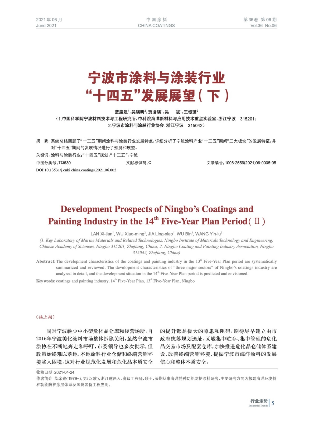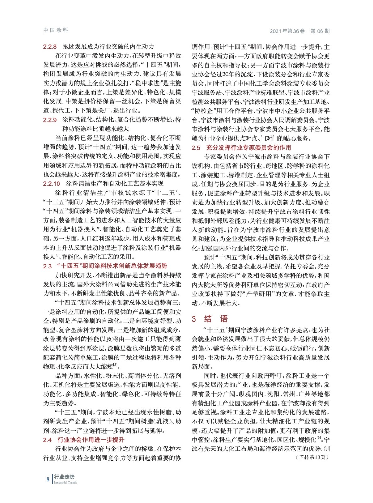系統總結回顧了“十三五”期間涂料與涂裝行業發展特點,詳細分析了寧波涂料產業“十三五”期間“三大板塊”的發展特征,并對“十四五”期間的發展情況進行了預測和展望。