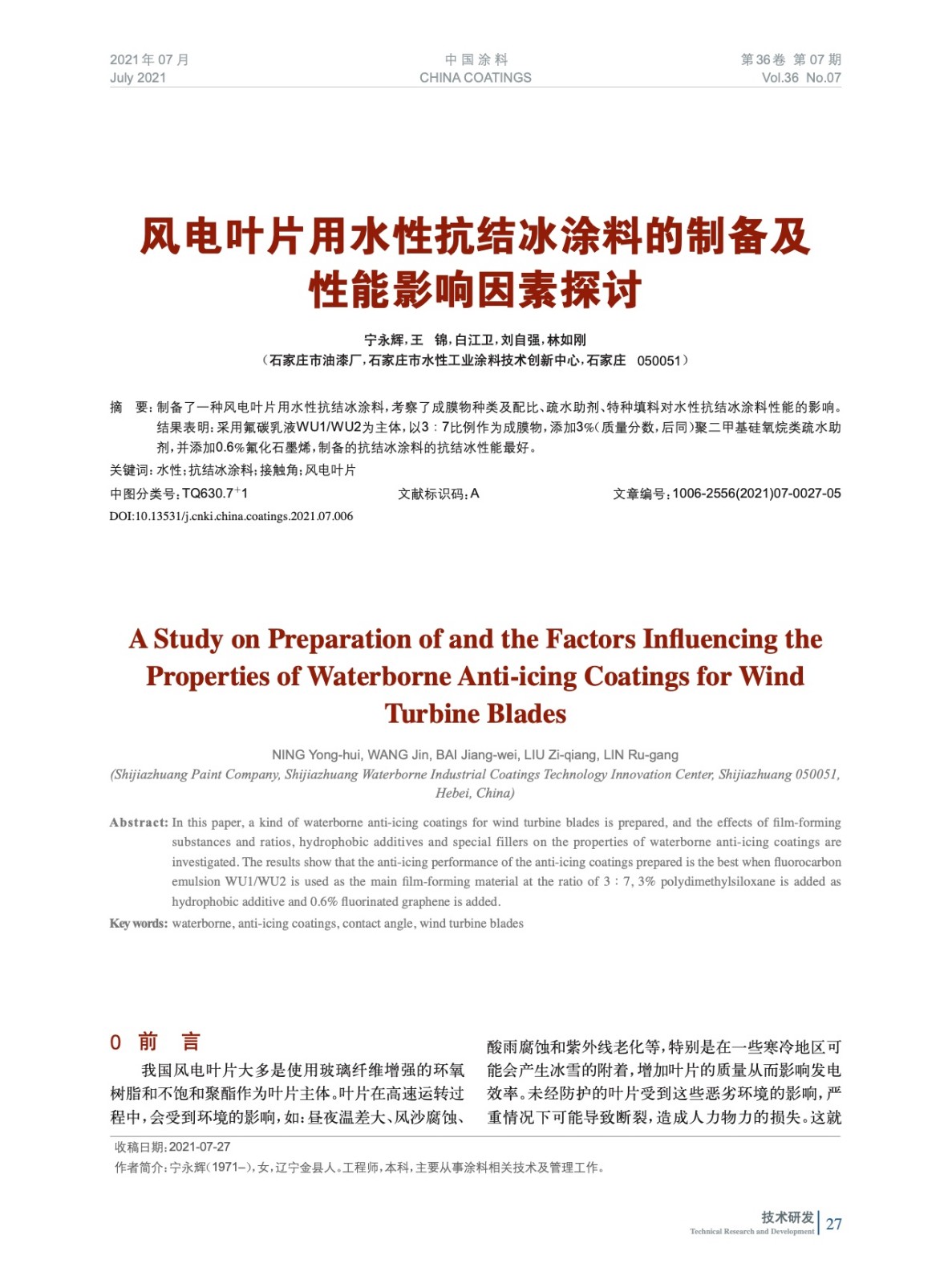 摘要:制備了一種風(fēng)電葉片用水性抗結(jié)冰涂料,考察了成膜物種類及配比、疏水助劑、特種填料對(duì)水性抗結(jié)冰涂料性能的影響。結(jié)果表明:采用氟碳乳液WU1/WU2為主體,以3︰7比例作為成膜物,添加3%(質(zhì)量分?jǐn)?shù),后同)聚二甲基硅氧烷類疏水助劑,并添加0.6%氟化石墨烯,制備的抗結(jié)冰涂料的抗結(jié)冰性能最好。