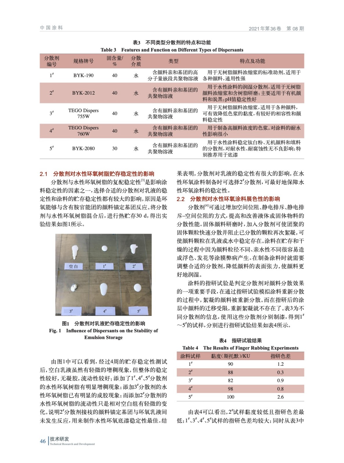 摘要:通過對水性環(huán)氧涂料的研究,深入分析了不同分散劑對水性環(huán)氧涂料的穩(wěn)定性、顏料分散性、防腐性的影響。結(jié)果表明,篩選合適的分散劑有利于水性環(huán)氧涂料的貯存穩(wěn)定性,同時也能最大限度地降低分散劑對涂膜性能的影響;在水性環(huán)氧面漆中,選擇合適的分散劑可使顏料充分展色并防止顏料絮凝,避免浮色、發(fā)花等涂膜弊病,使水性涂料涂裝后顏色均一。