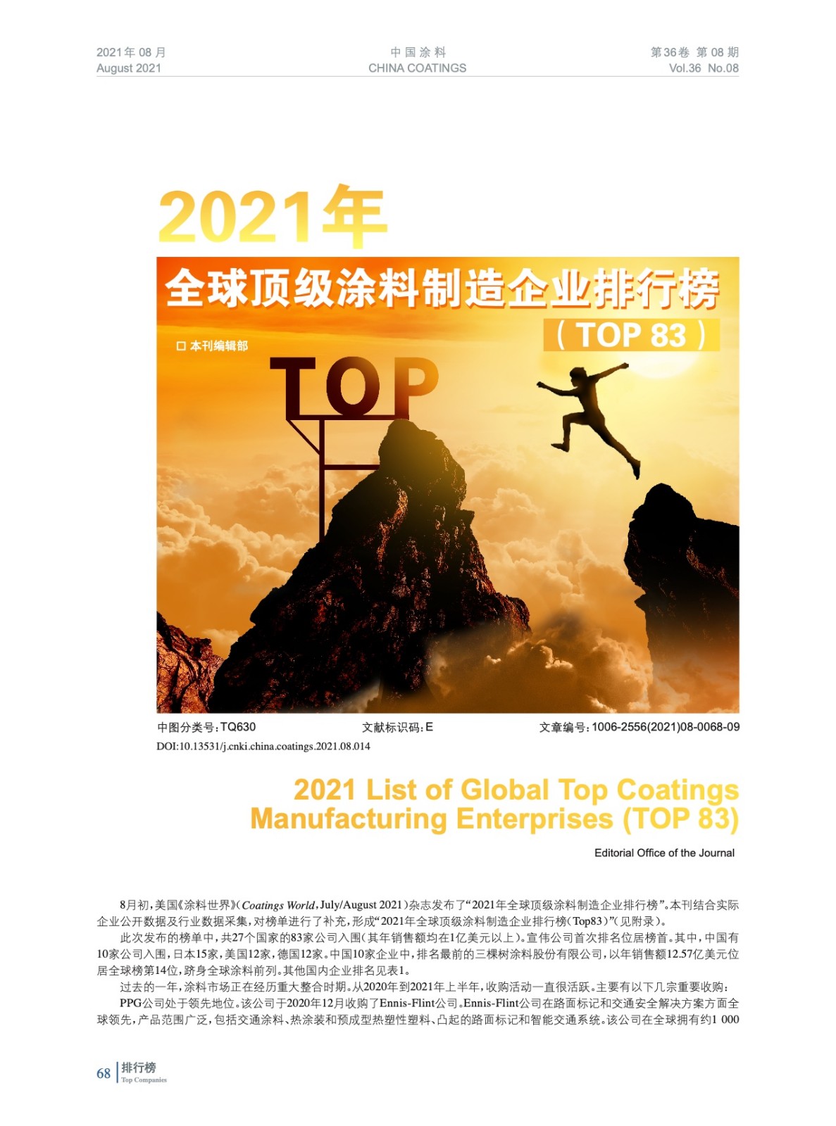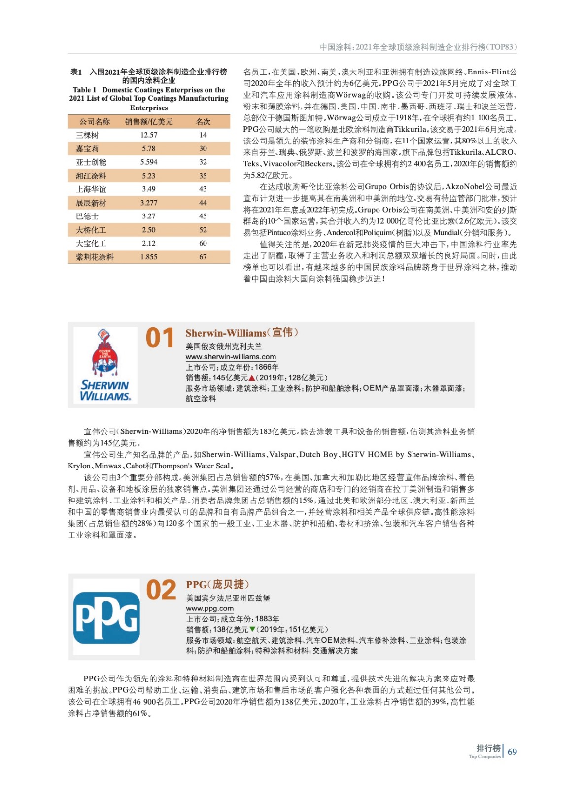 摘要:8月初,美國《涂料世界》(Coatings World,July/August 2021)雜志發布了“2021年全球頂級涂料制造企業排行榜”。本刊結合實際企業公開數據及行業數據采集,對榜單進行了補充,形成“2021年全球頂級涂料制造企業排行榜(TOP 83)。