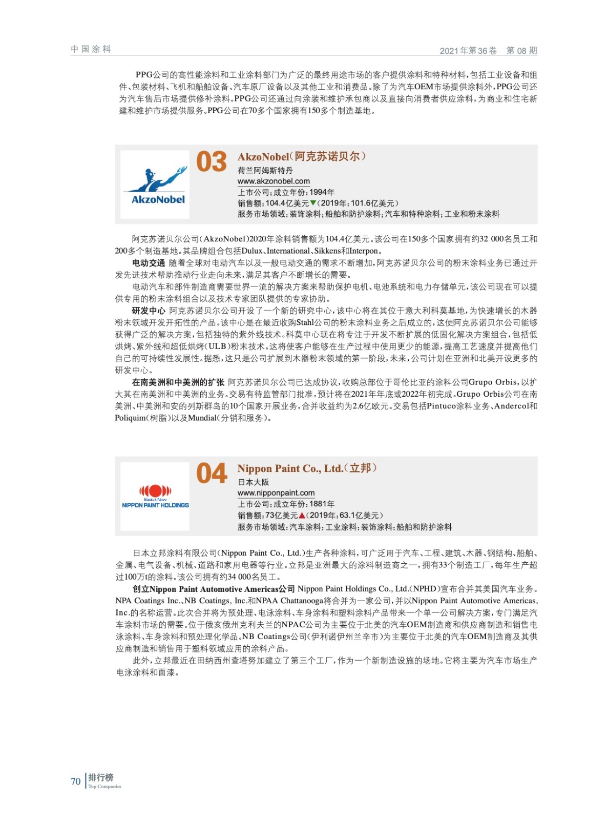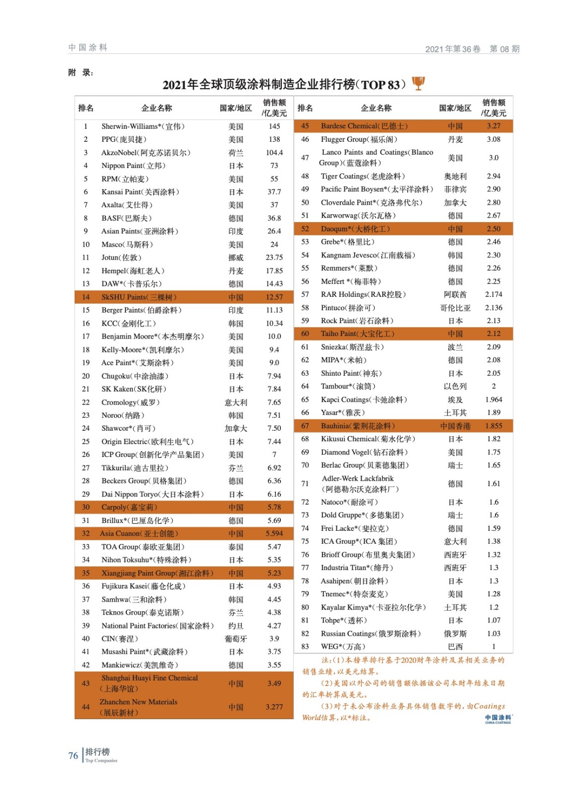 2021年全球頂級涂料制造企業排行榜(TOP 83)