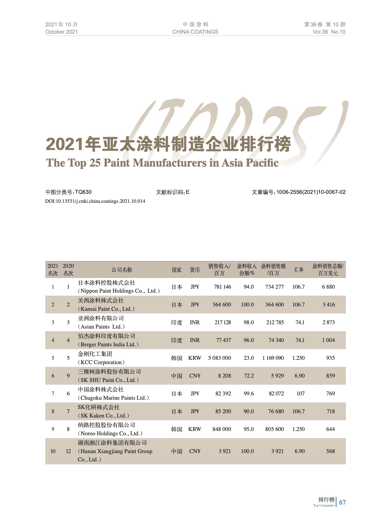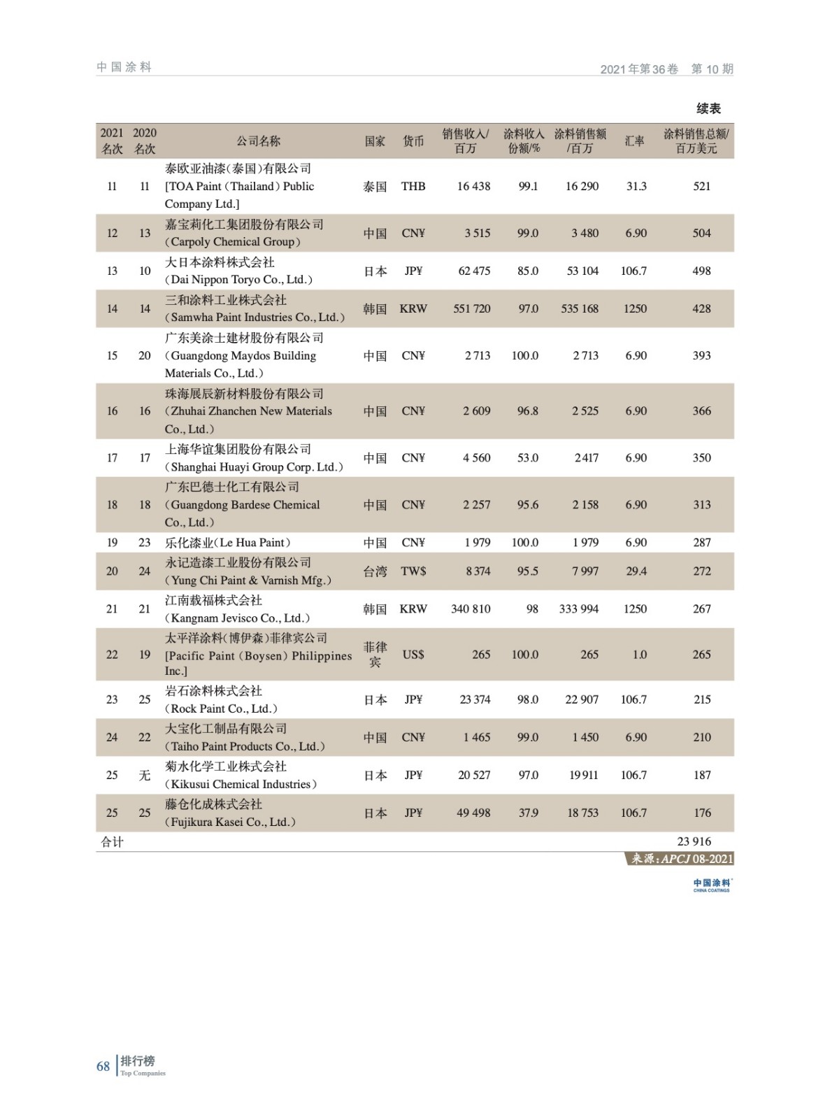 2021年亞太涂料制造企業排行榜(TOP25)