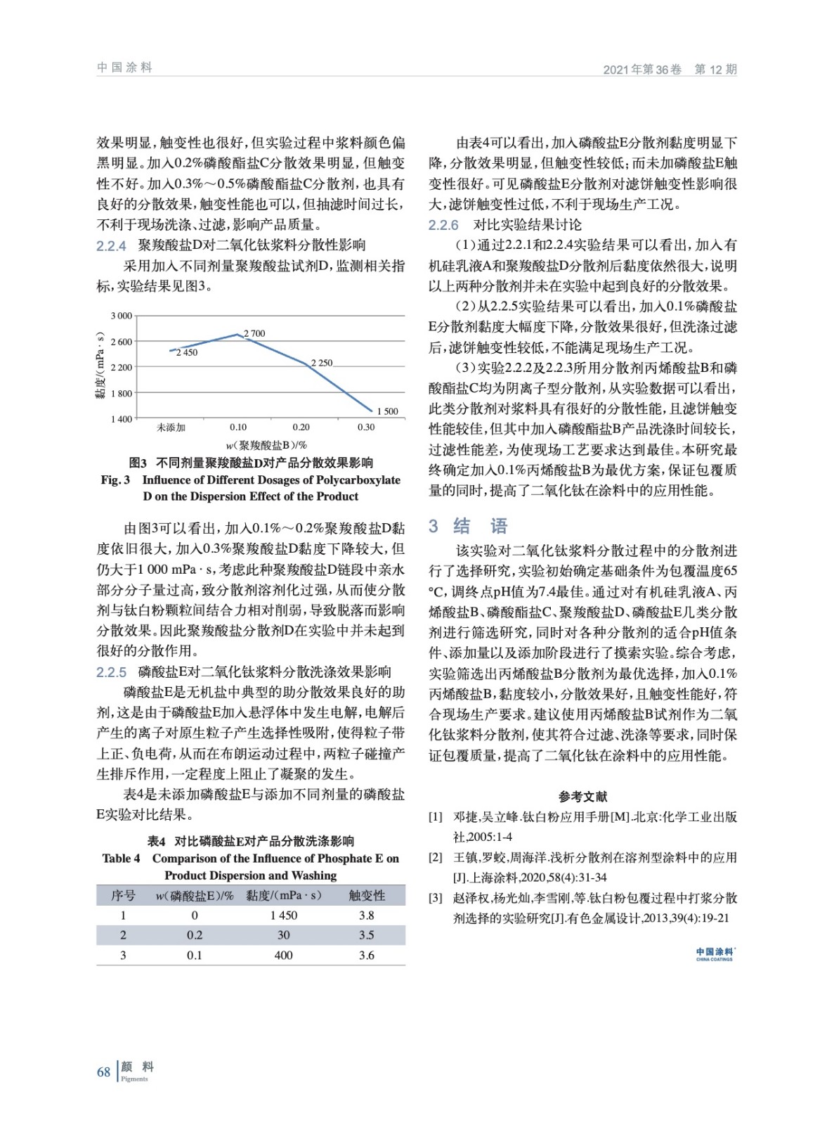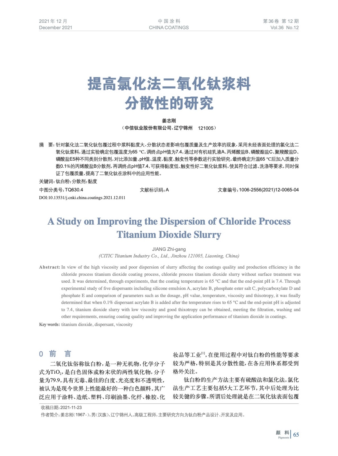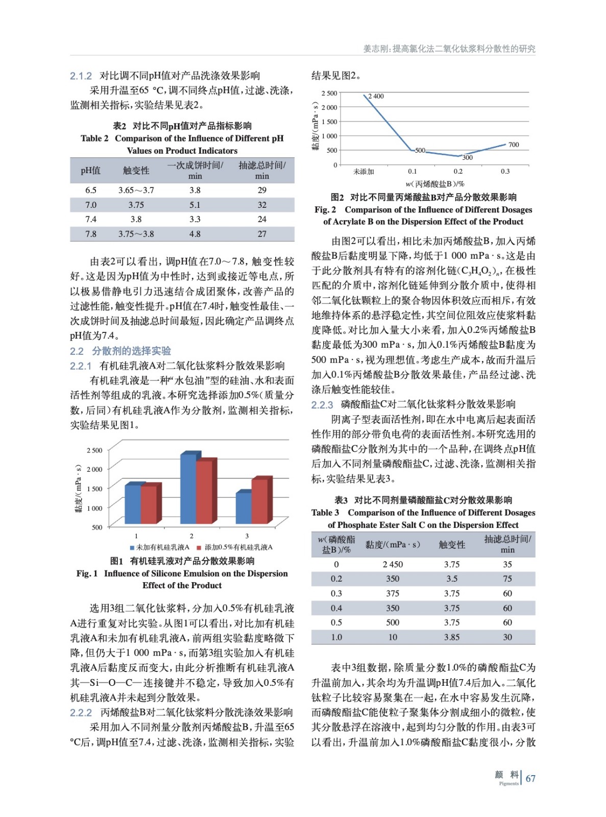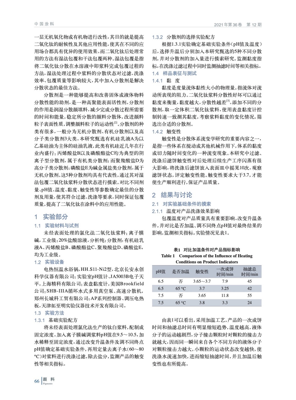 摘要:采用未經表面處理的氯化法二氧化鈦漿料,通過實驗確定包覆溫度為65 ℃,調終點pH值為7.4,通過對5種不同類別分散劑,對比添加量、pH值、溫度、黏度、觸變性等參數進行實驗研究,最終確定升溫65 ℃后加入質量分數0.1%的丙烯酸鹽B分散劑,再調終點pH值7.4,可獲得黏度低、觸變性好二氧化鈦漿料,使其符合過濾、洗滌等要求,同時保證了包覆質量,提高了二氧化鈦在涂料中的應用性能。