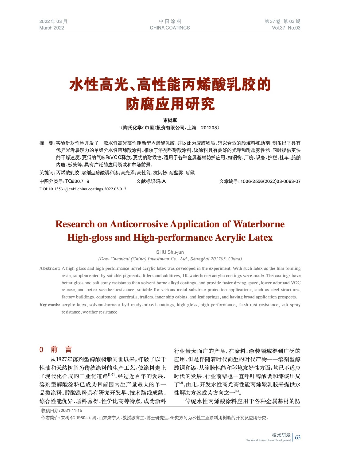 水性高光、高性能丙烯酸乳膠的防腐應用研究