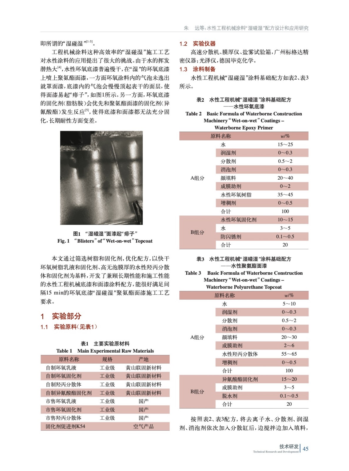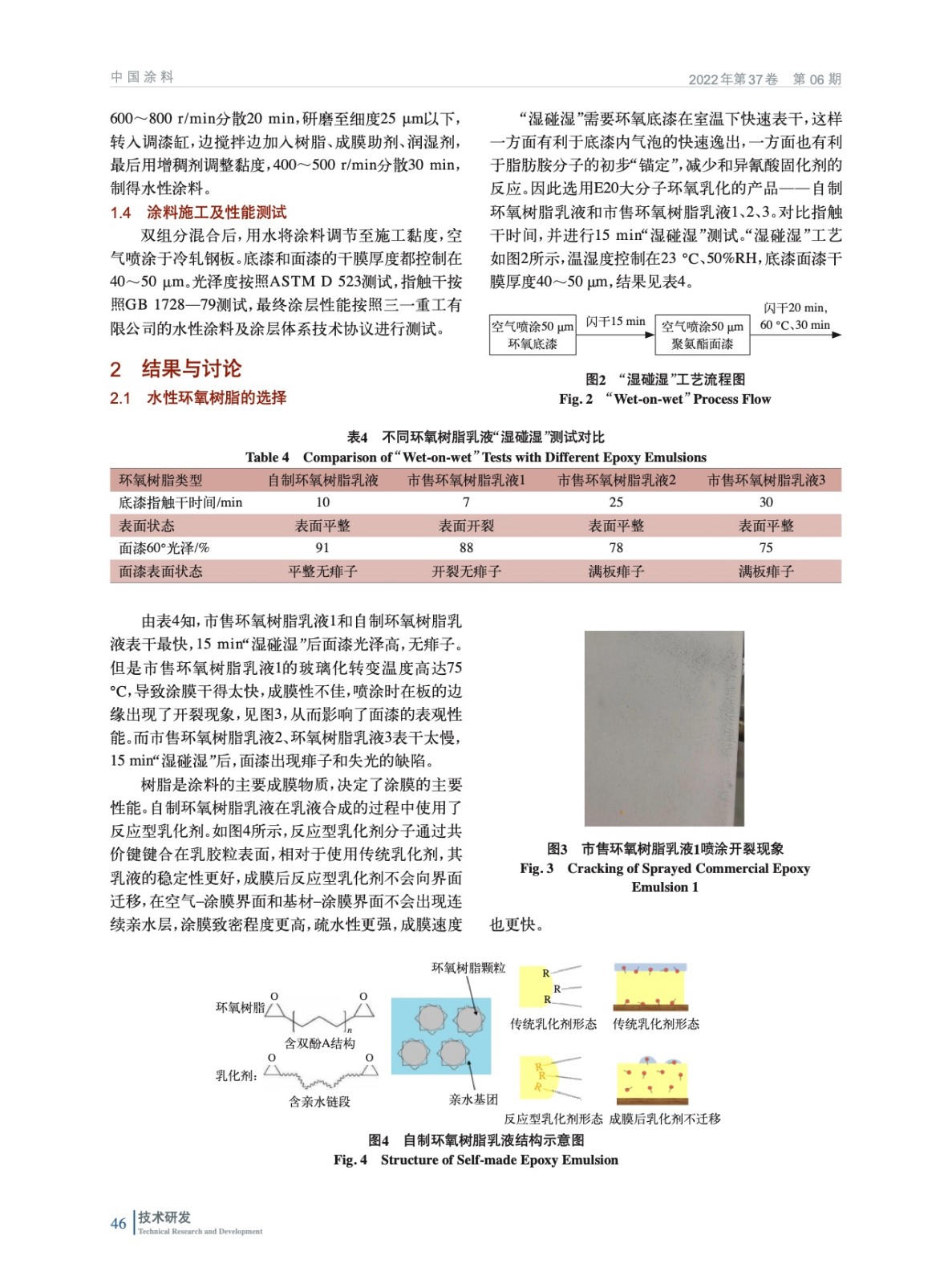 通過使用快干的水性環氧樹脂和固化劑、高無泡膜厚的水性羥丙分散體和固化劑,并通過配方優化,開發了兼顧長期性能和施工性能的水性工程機械底漆和面漆涂料配方,能滿足間隔15 min的環氧底漆“濕碰濕”聚氨酯面漆施工工藝要求。