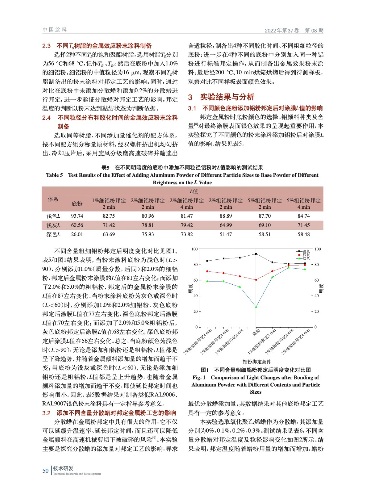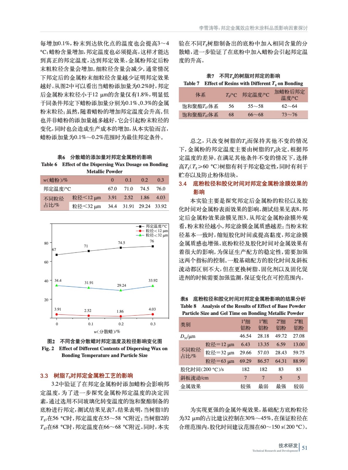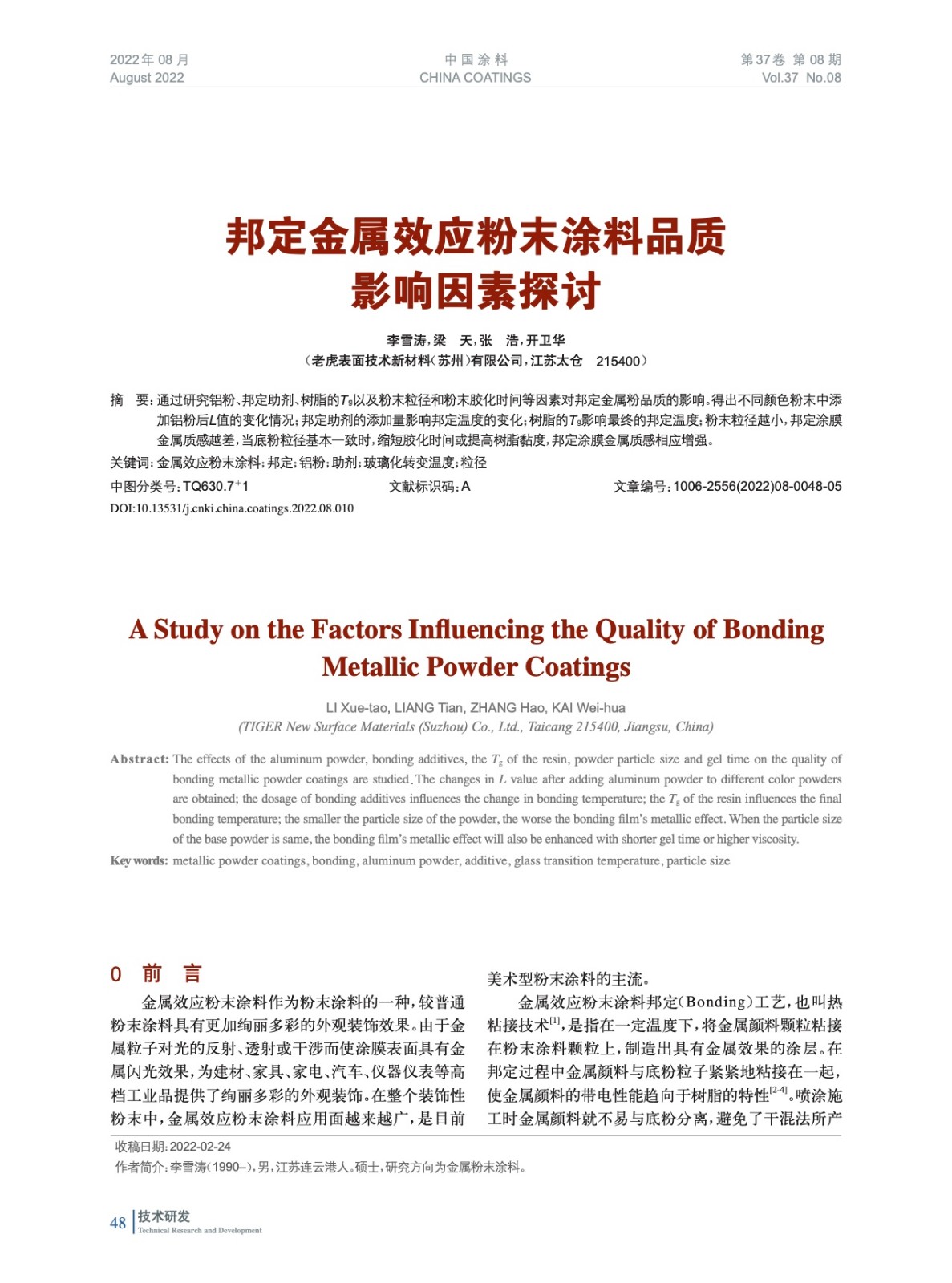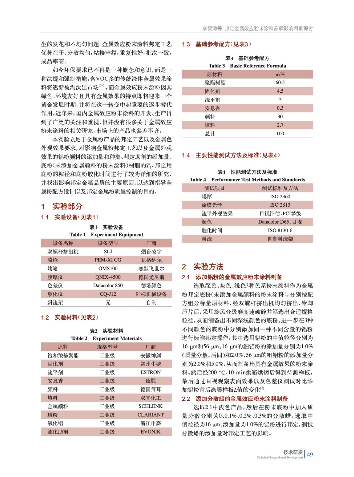 摘要:通過研究鋁粉、邦定助劑、樹脂的Tg以及粉末粒徑和粉末膠化時間等因素對邦定金屬粉品質的影響。得出不同顏色粉末中添加鋁粉后L值的變化情況;邦定助劑的添加量影響邦定溫度的變化;樹脂的Tg影響最終的邦定溫度;粉末粒徑越小,邦定涂膜金屬質感越差,當底粉粒徑基本一致時,縮短膠化時間或提高樹脂黏度,邦定涂膜金屬質感相應增強。