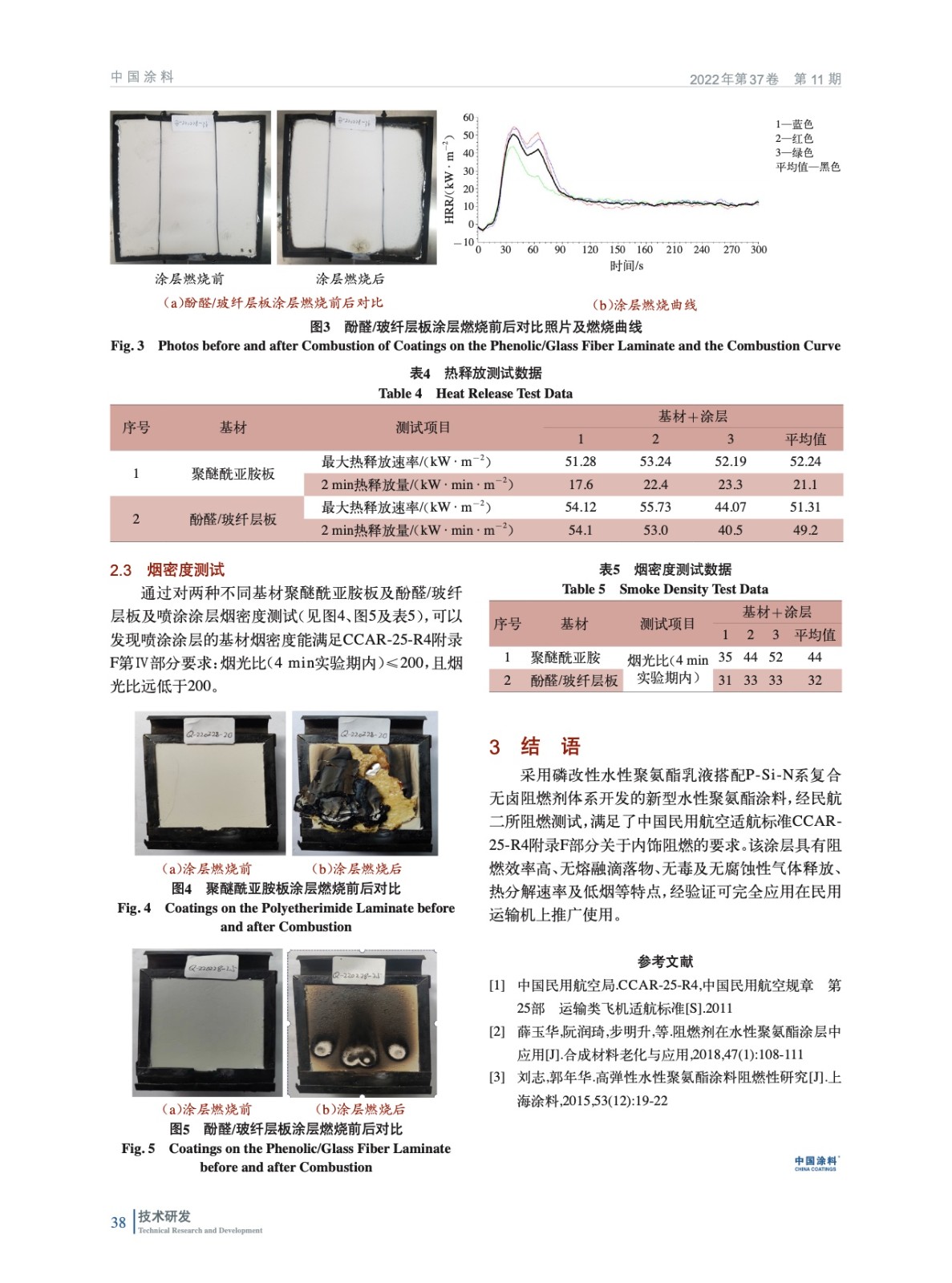 摘要:針對(duì)飛機(jī)內(nèi)飾對(duì)水性聚氨酯涂層高阻燃要求,采用磷改性水性聚氨酯乳液搭配P-Si-N(磷–硅–氮)系復(fù)合無(wú)鹵阻燃劑體系開發(fā)了新型高阻燃水性聚氨酯涂層,涂覆在聚碳酸酯板、聚醚酰亞胺及酚醛/玻纖層板3種基材上,與空白板進(jìn)行燃燒對(duì)比實(shí)驗(yàn),測(cè)試結(jié)果達(dá)到了《中國(guó)民用航空規(guī)章 第25部 運(yùn)輸類飛機(jī)適航標(biāo)準(zhǔn)》[CCAR-25-R4]附錄F部分關(guān)于內(nèi)飾阻燃的要求,涂層具有阻燃效率高、無(wú)熔融滴落物、無(wú)毒及無(wú)腐蝕性氣體釋放、低煙等特點(diǎn),經(jīng)驗(yàn)證可完全應(yīng)用在航空內(nèi)飾上推廣使用。