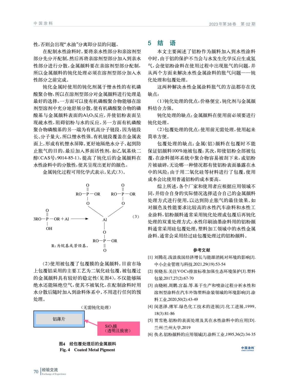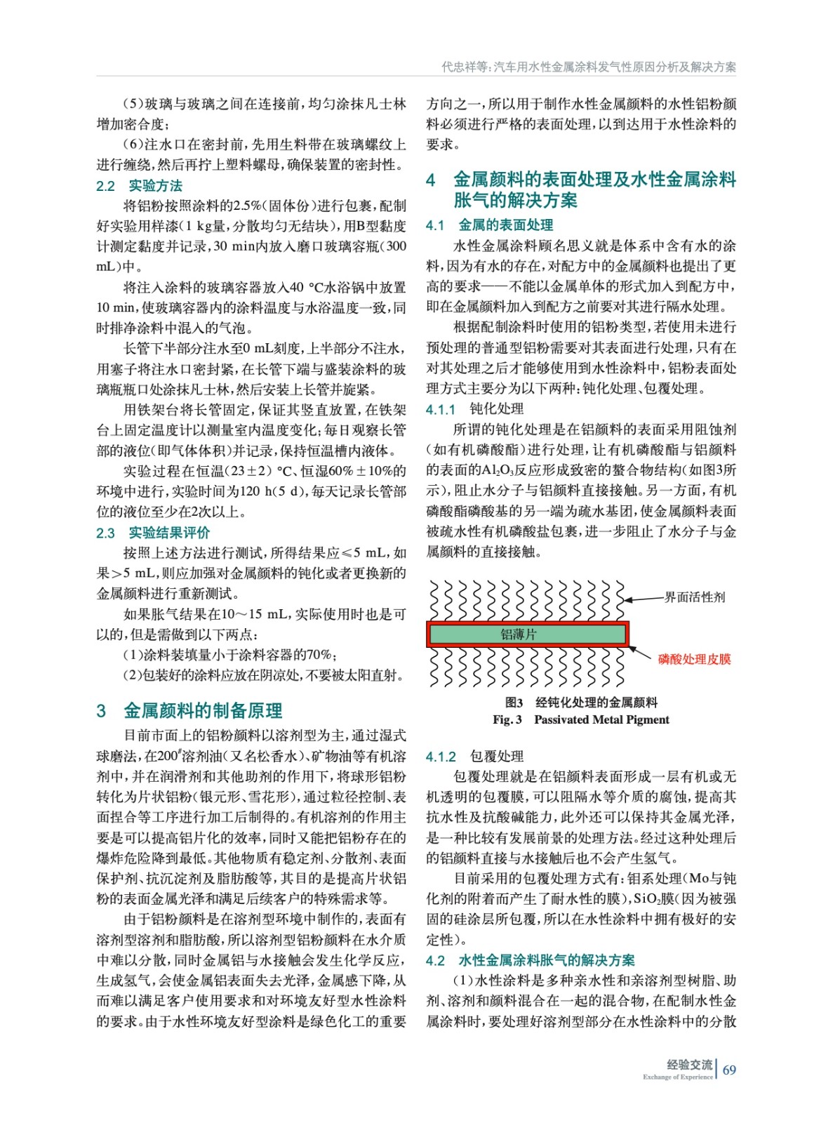 論述了水性金屬涂料發(fā)氣的原因、發(fā)氣性測試方法,以及通過對金屬顏料(鋁)進行包覆或在加入水性涂料前對鋁顏料先進行鈍化處理來解決水性涂料脹氣的問題。