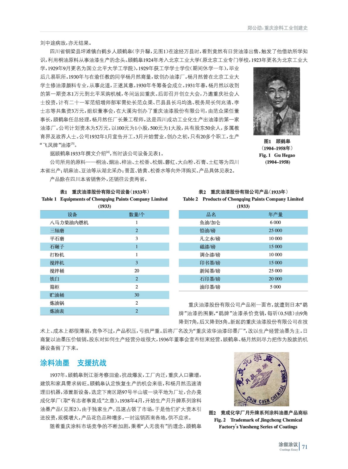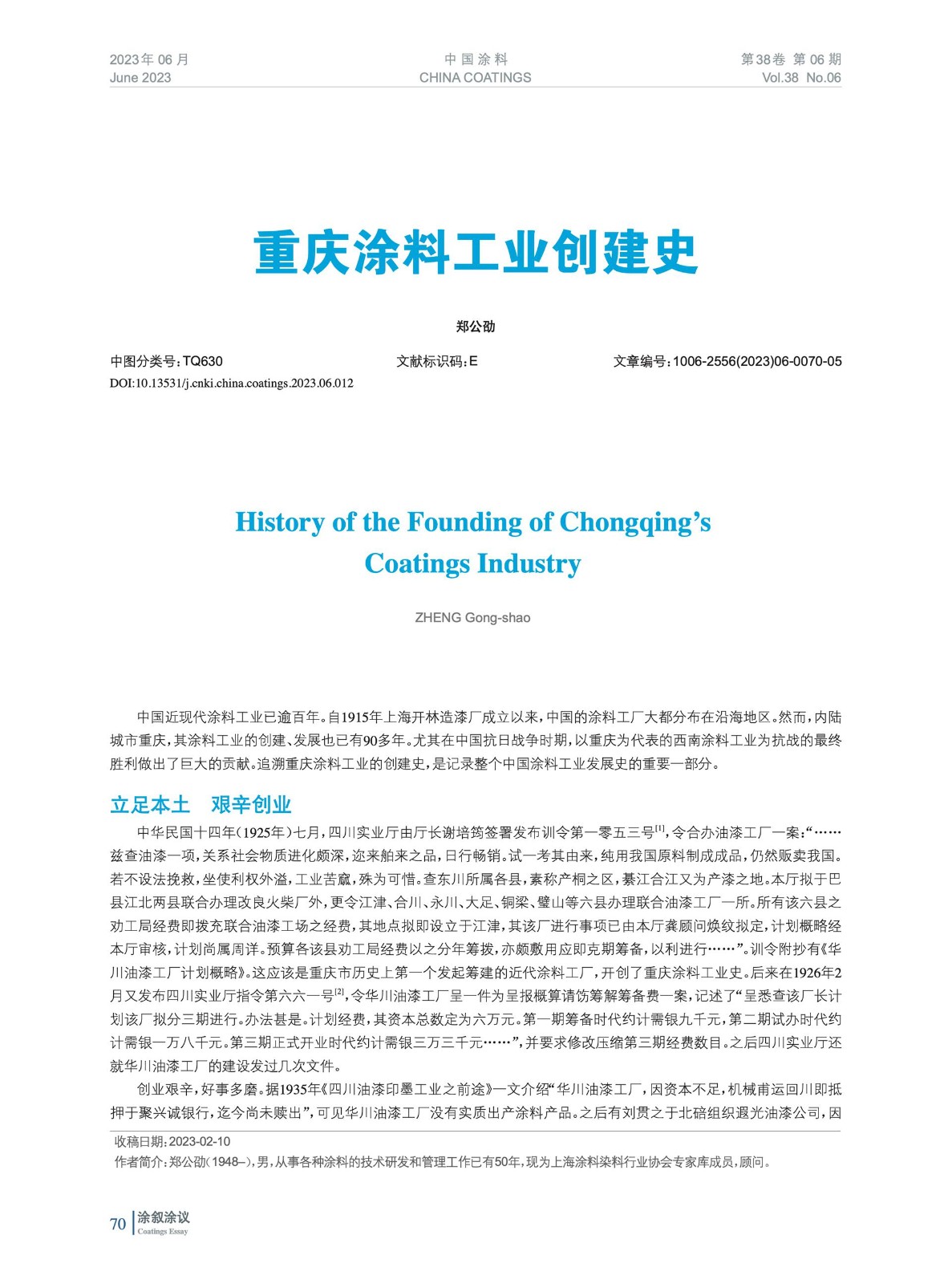 摘要:中國(guó)近現(xiàn)代涂料工業(yè)已逾百年。自1915年上海開(kāi)林造漆廠成立以來(lái),中國(guó)的涂料工廠大都分布在沿海地區(qū)。然而,內(nèi)陸城市重慶,其涂料工業(yè)的創(chuàng)建、發(fā)展也已有90多年。尤其在中國(guó)抗日戰(zhàn)爭(zhēng)時(shí)期,以重慶為代表的西南涂料工業(yè)為抗戰(zhàn)的最終勝利做出了巨大的貢獻(xiàn)。追溯重慶涂料工業(yè)的創(chuàng)建史,是記錄整個(gè)中國(guó)涂料工業(yè)發(fā)展史的重要一部分。