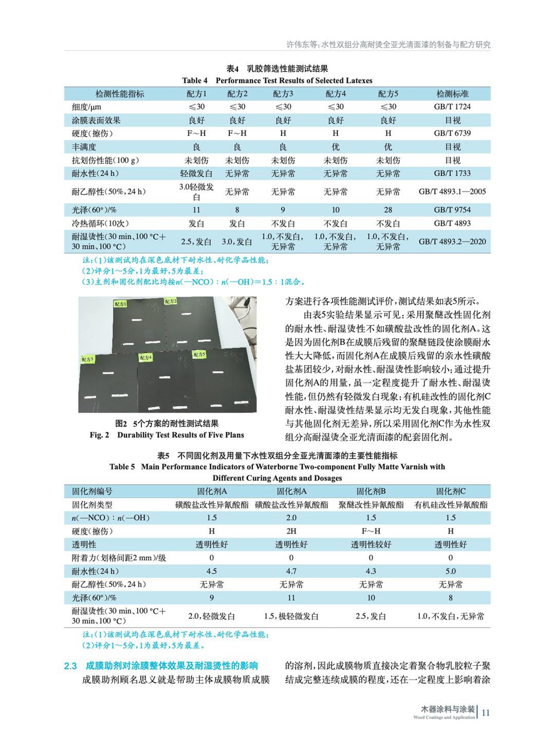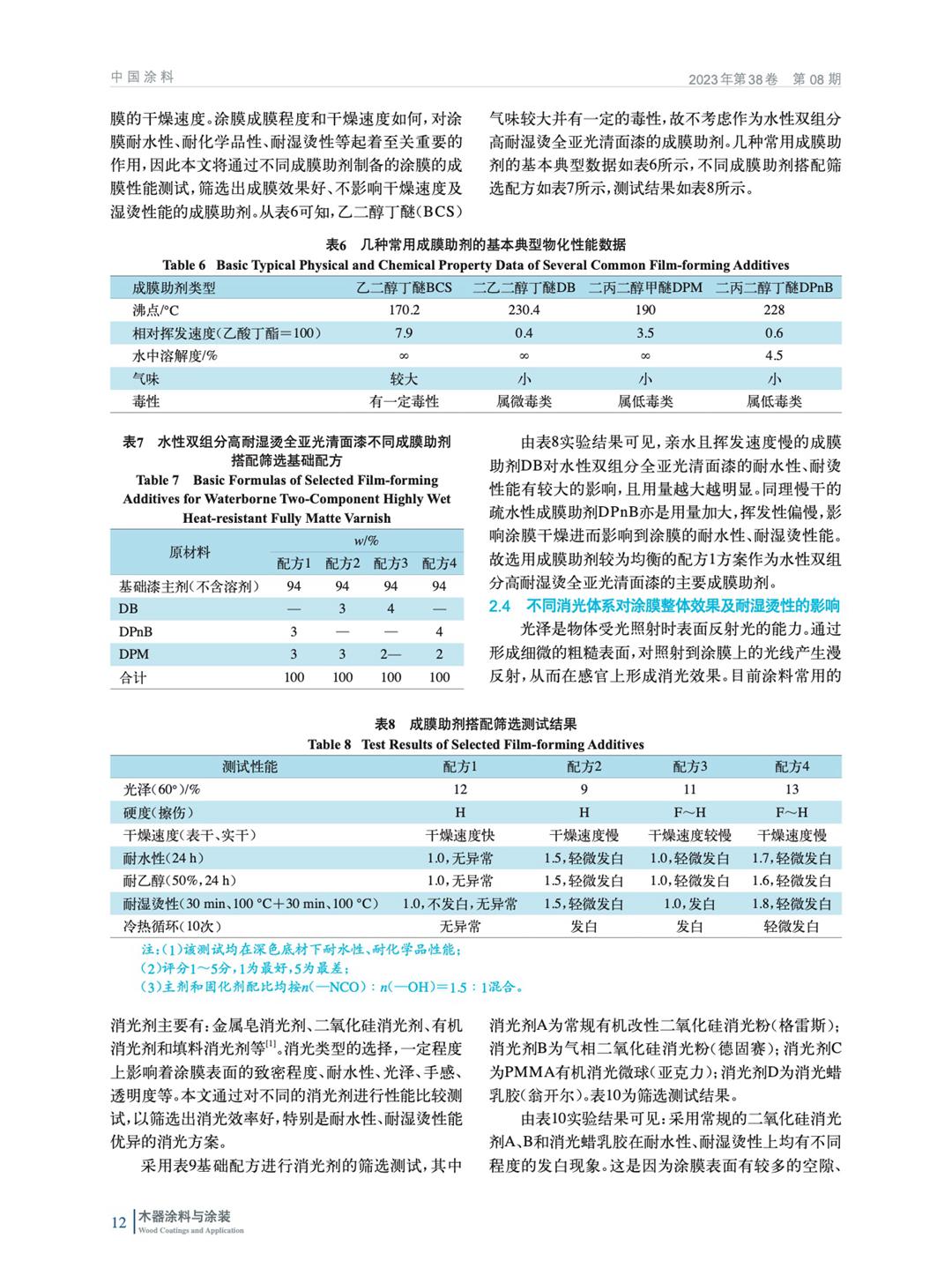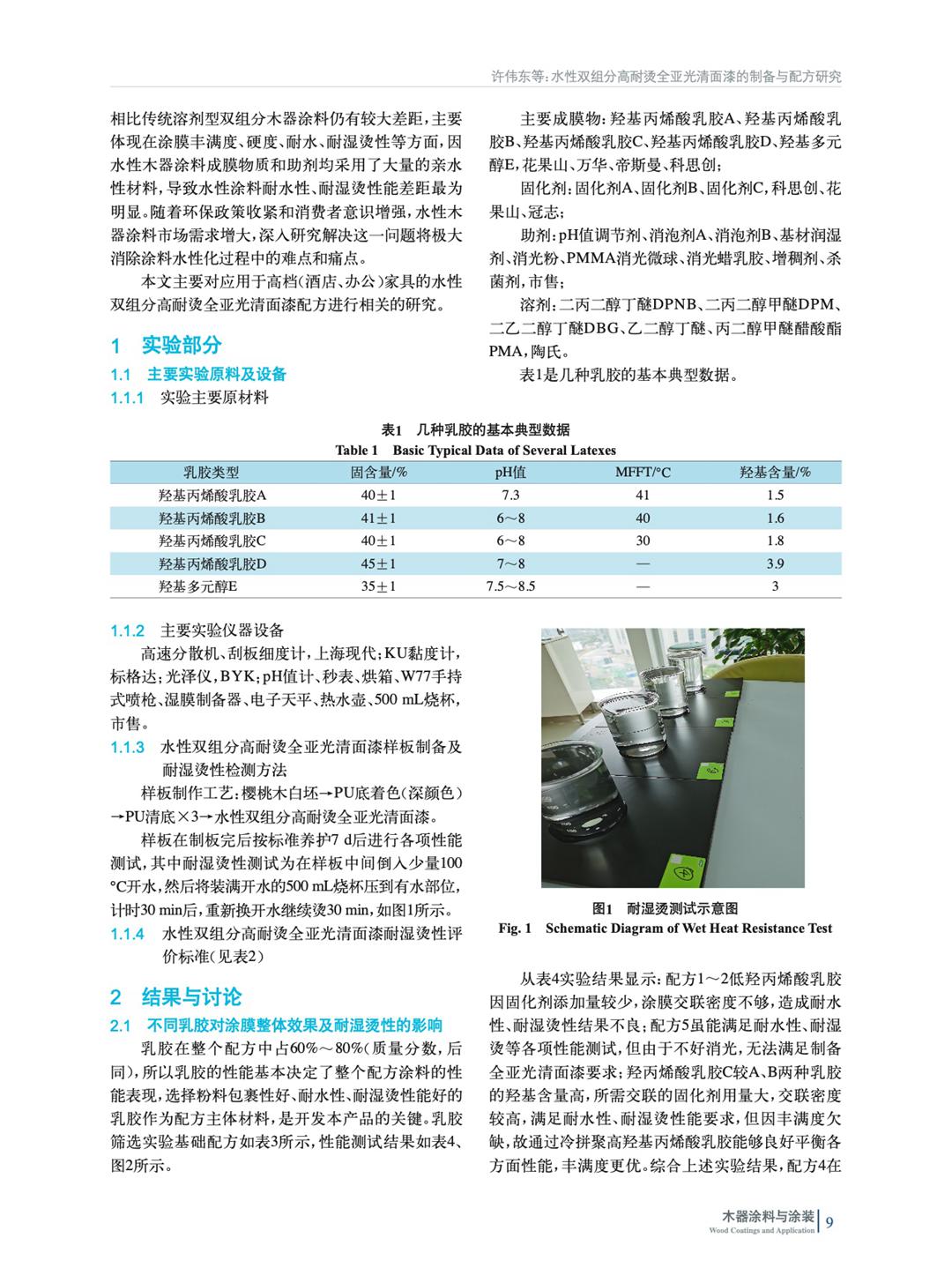 通過對乳膠、水性固化劑、消光材料、成膜助劑的篩選、配方優化調整,制備出一款應用于高檔(酒店、辦公)家具上各項性能優異的水性雙組分高耐燙全亞光清面漆,并對影響因素進行了研究。