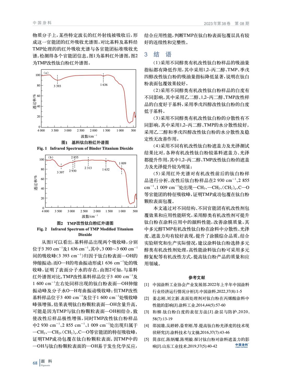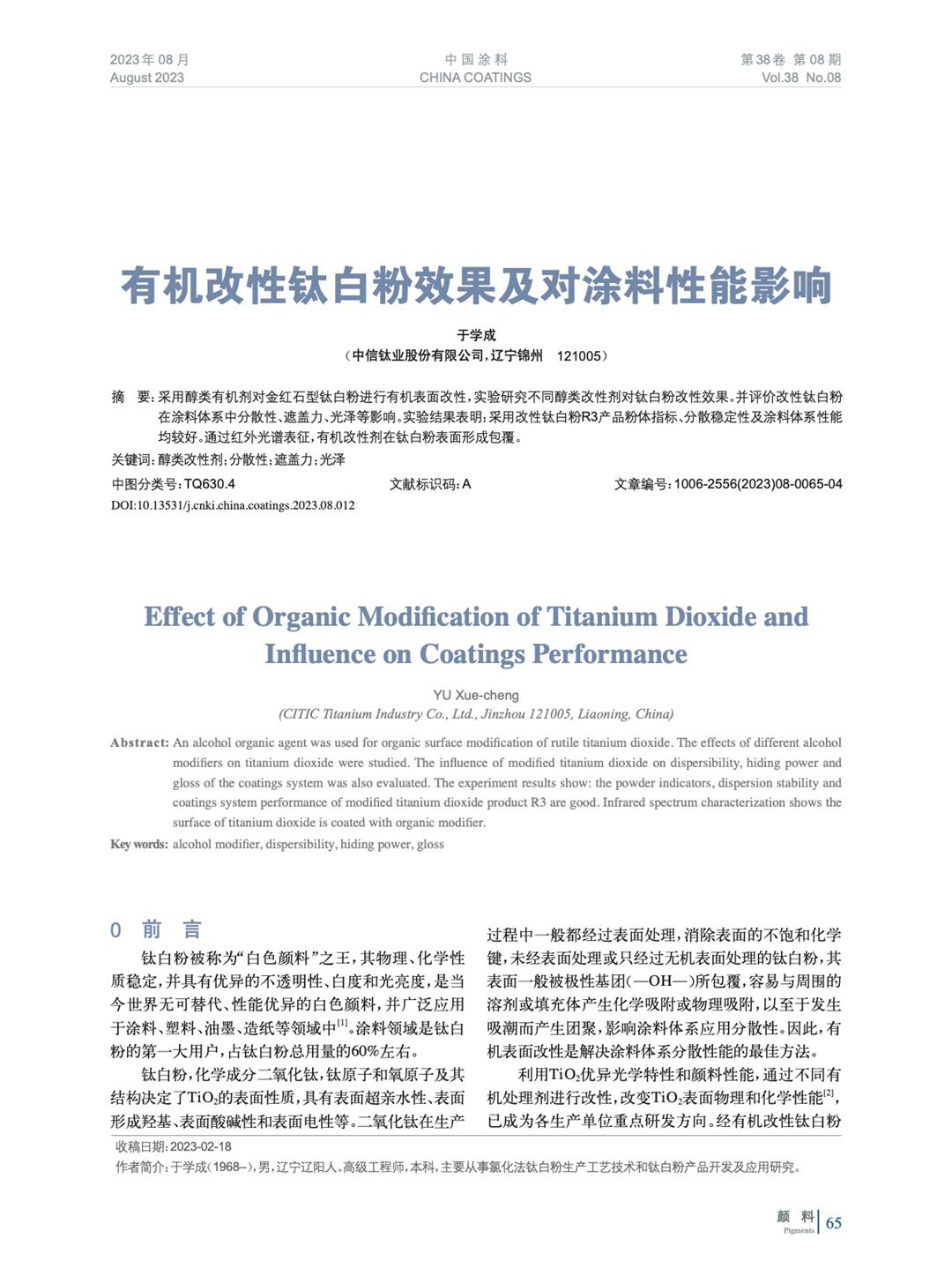 摘要:采用醇類有機劑對金紅石型鈦白粉進行有機表面改性,實驗研究不同醇類改性劑對鈦白粉改性效果。并評價改性鈦白粉在涂料體系中分散性、遮蓋力、光澤等影響。實驗結果表明:采用改性鈦白粉R3產(chǎn)品粉體指標、分散穩(wěn)定性及涂料體系性能均較好。通過紅外光譜表征,有機改性劑在鈦白粉表面形成包覆。