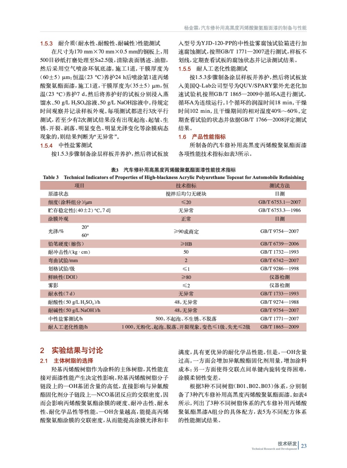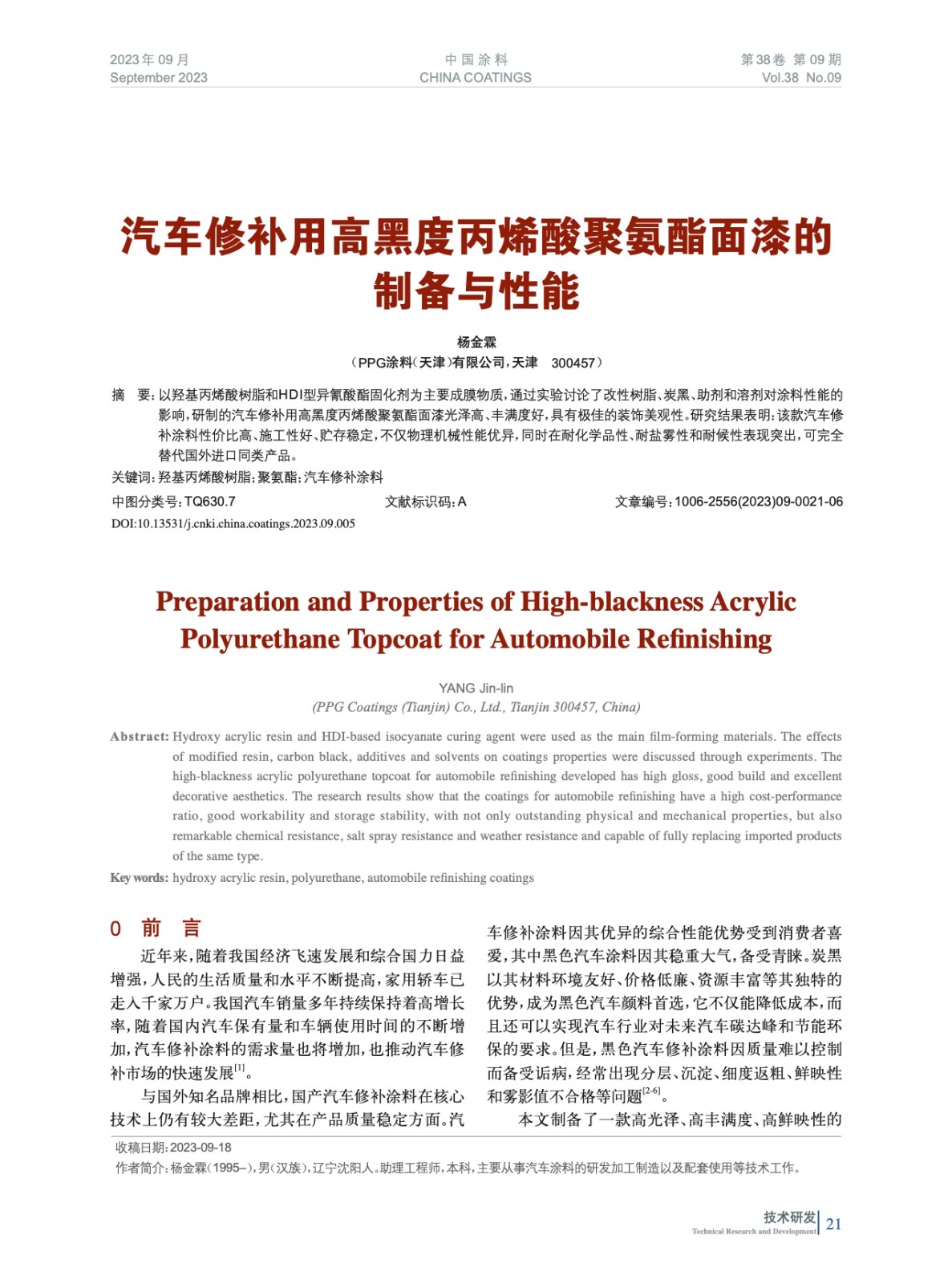 汽車修補用高黑度丙烯酸聚氨酯面漆的制備與性能