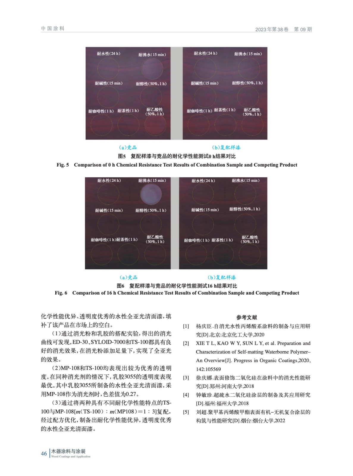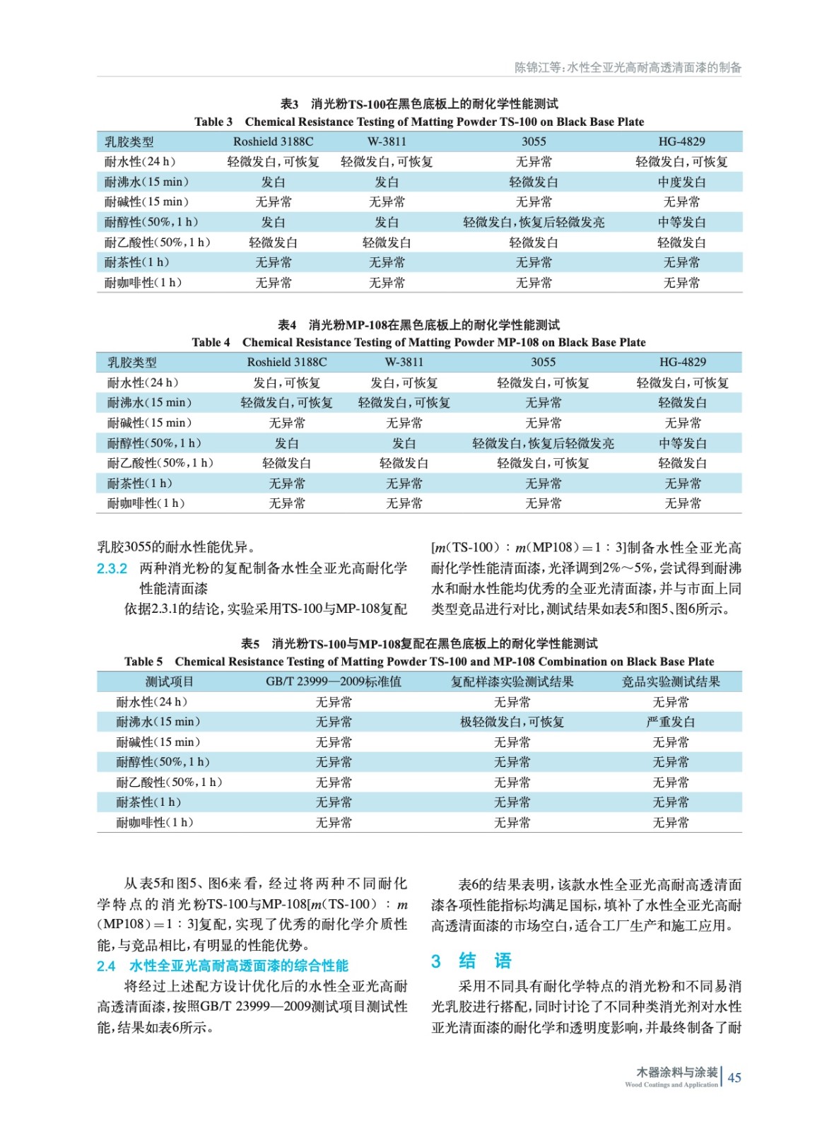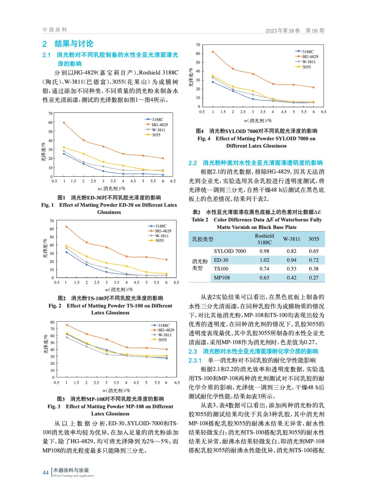 摘要:以水性樹脂、消光粉和其他助劑為原料,通過配方優化改進,制備了一種高耐化學性高透明度的水性全亞光清面漆。探討了乳膠、消光粉的種類對最終研制的水性全亞光(光澤為2%~5%)清面漆耐化學性和透明度的影響,采用色差儀測試,進行對涂膜的透明度進行評估。結果表明,當配方采用水性樹脂3055、消光粉TS100、消光粉MP108時,最終制得的全亞光清面漆的涂膜透明度和耐化學均達到最佳,在標準黑色底板的色差僅為0.27。