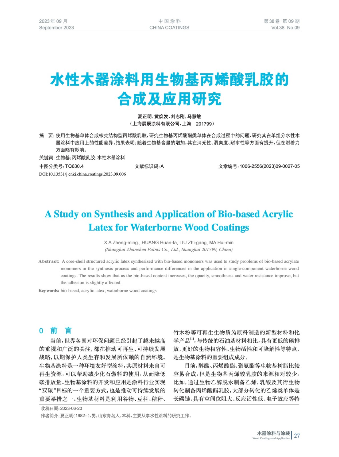 摘要:使用生物基單體合成核殼結構型丙烯酸乳膠,研究生物基丙烯酸酯類單體在合成過程中的問題,研究其在單組分水性木器涂料中應用上的性能差異。結果表明:隨著生物基含量的增加,其在消光性、滑爽度、耐水性等方面有提升,但在附著力方面略有影響。