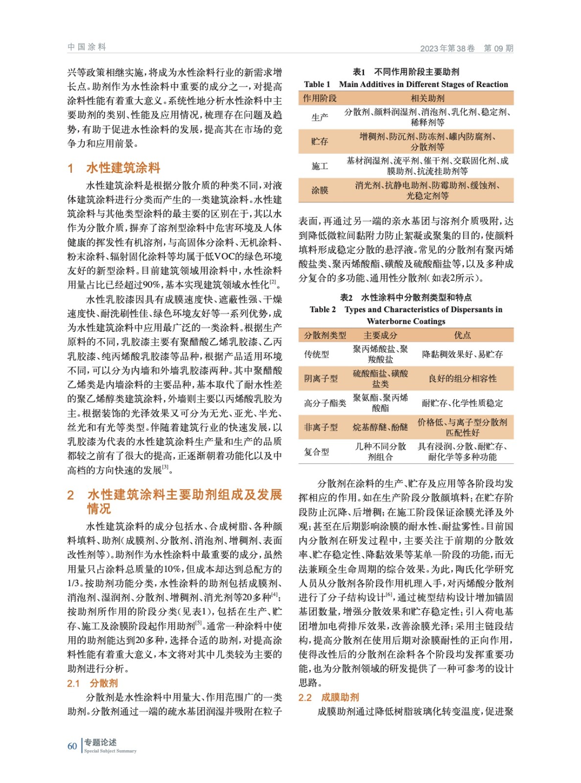 綜述了水性建筑涂料用分散劑、成膜助劑、增稠助劑、消泡劑、消光劑、防腐防霉劑等主要助劑的類型、特點及應用情況,并指出了水性建筑涂料助劑的未來研究重點。
