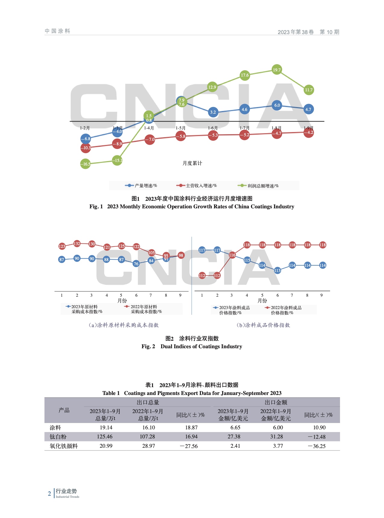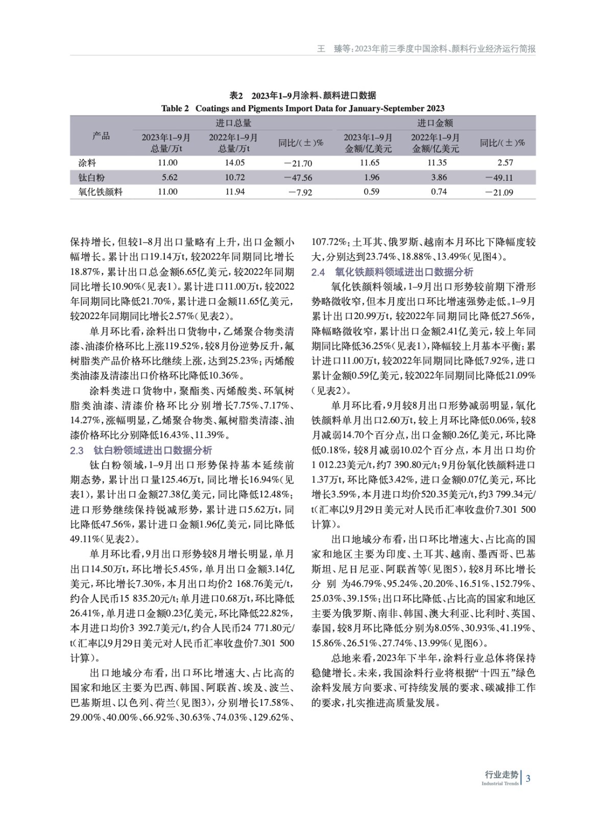 綜述了2023年前三季度我國涂料行業生產、經營簡況,包括經濟運行增速、涂料原材料采購成本和涂料成品價格雙指數情況,并對涂料、顏料行業進出口情況進行了分析。