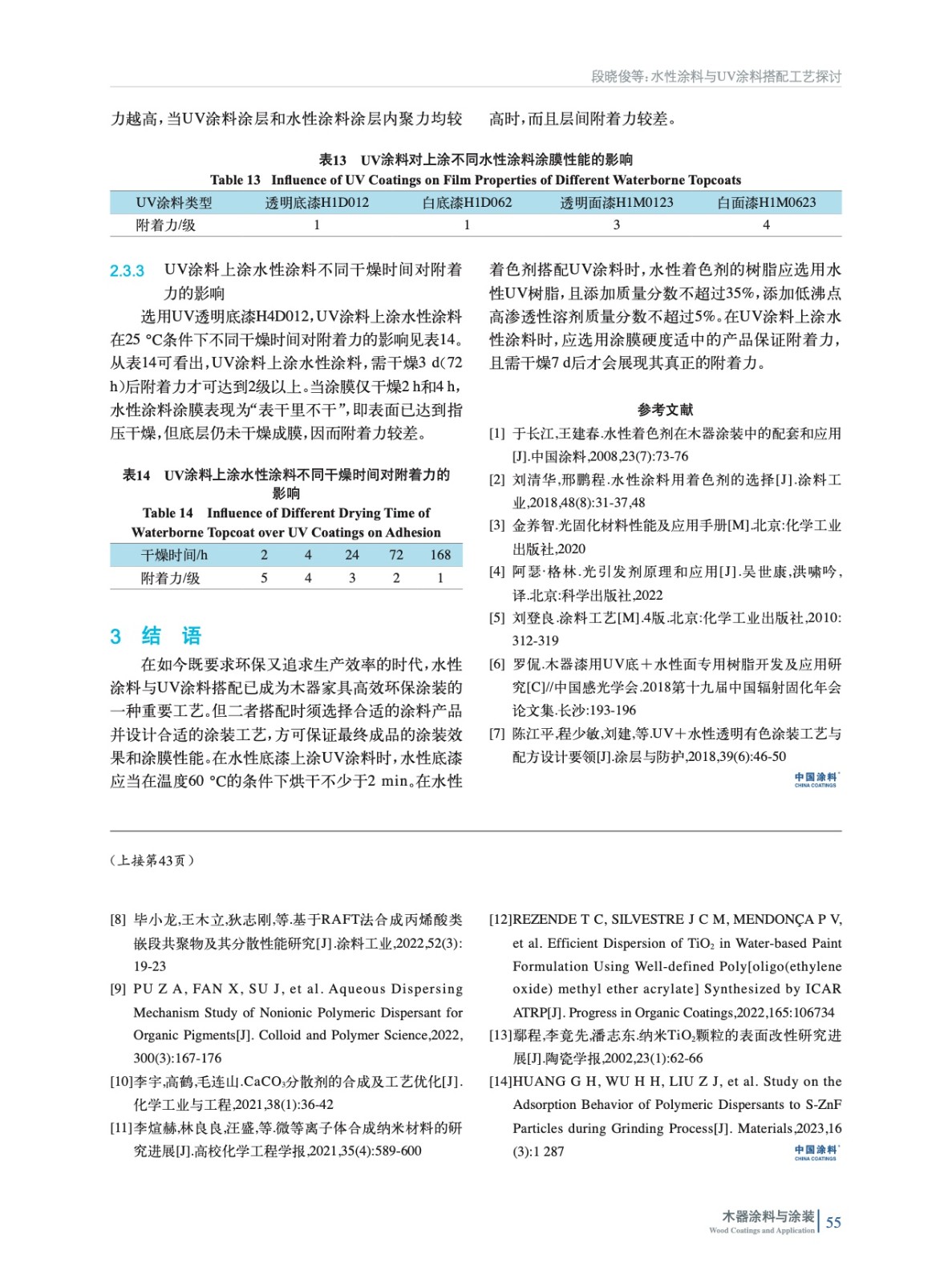 設計了水性底漆+上涂UV涂料、水性涂料著色劑+上涂UV涂料和UV涂料+上涂水性涂料3種涂裝工藝,探明了不同水性涂料、水性涂料中不同成分和不同過程控制參數對涂膜光澤、抗劃傷、起泡情況、附著力等性能的影響規律。