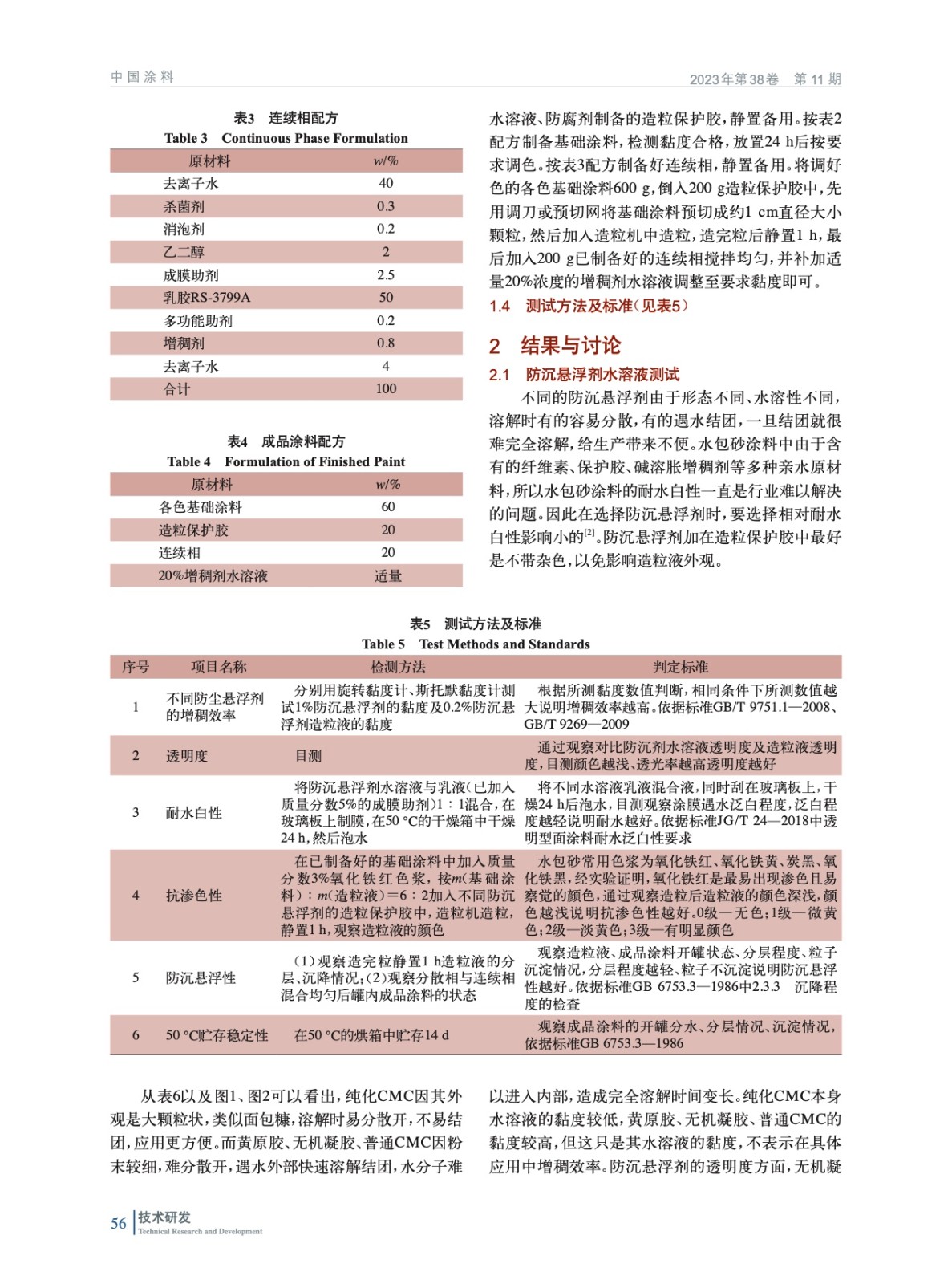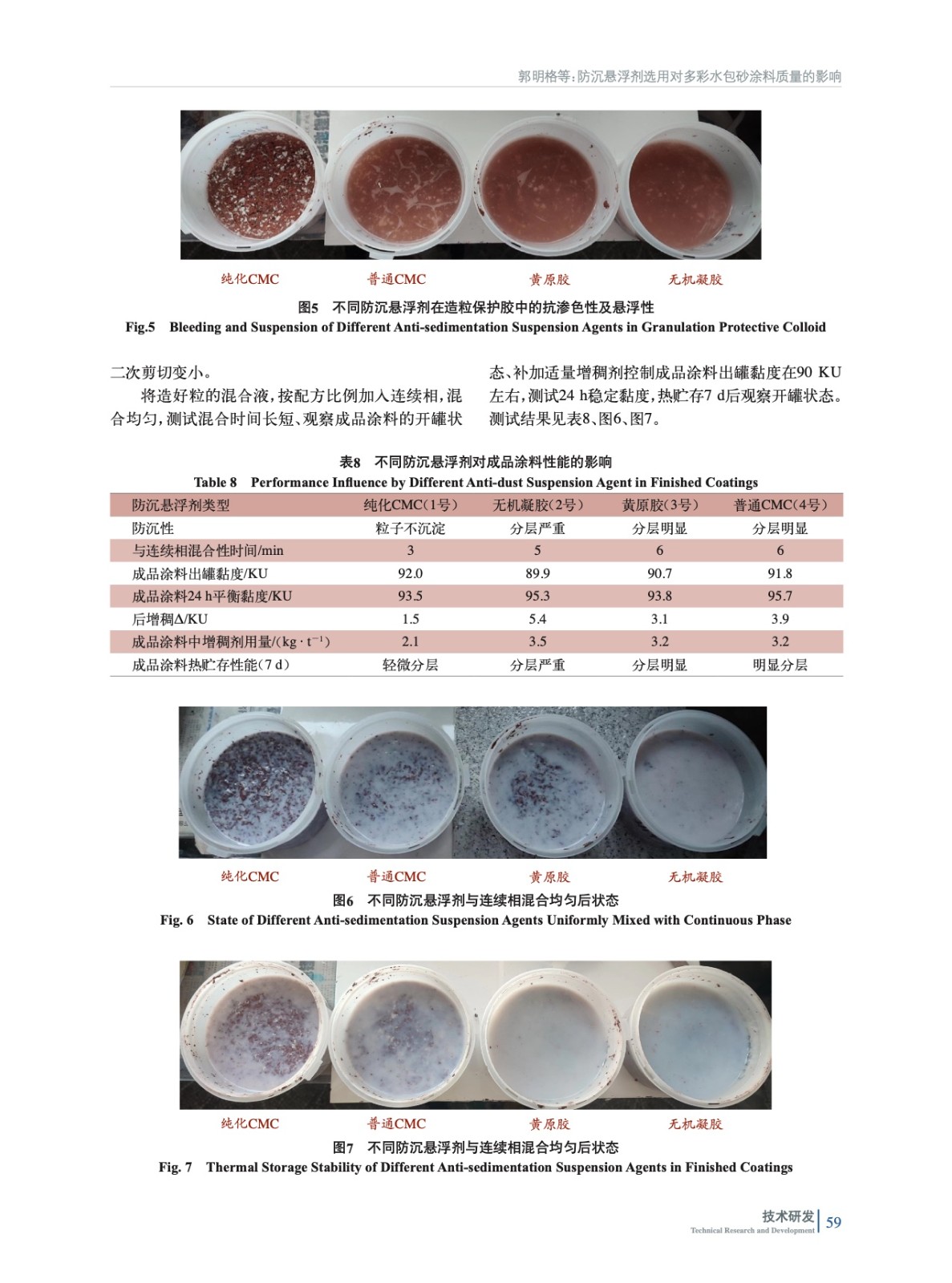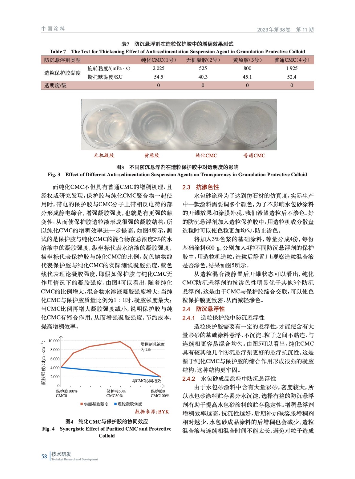 通過測試不同種類的防沉懸浮劑水溶液的耐水白性、防沉懸浮劑在造粒保護膠中的增稠效果、基礎涂料尤其是深色基礎涂料加入造粒保護膠后的抗滲色性及防沉懸浮性、成品涂料的加速貯存穩定性等,優選出了純化改性CMC作為水包砂多彩涂料的助劑時,產品的防沉劑懸浮性最優。
