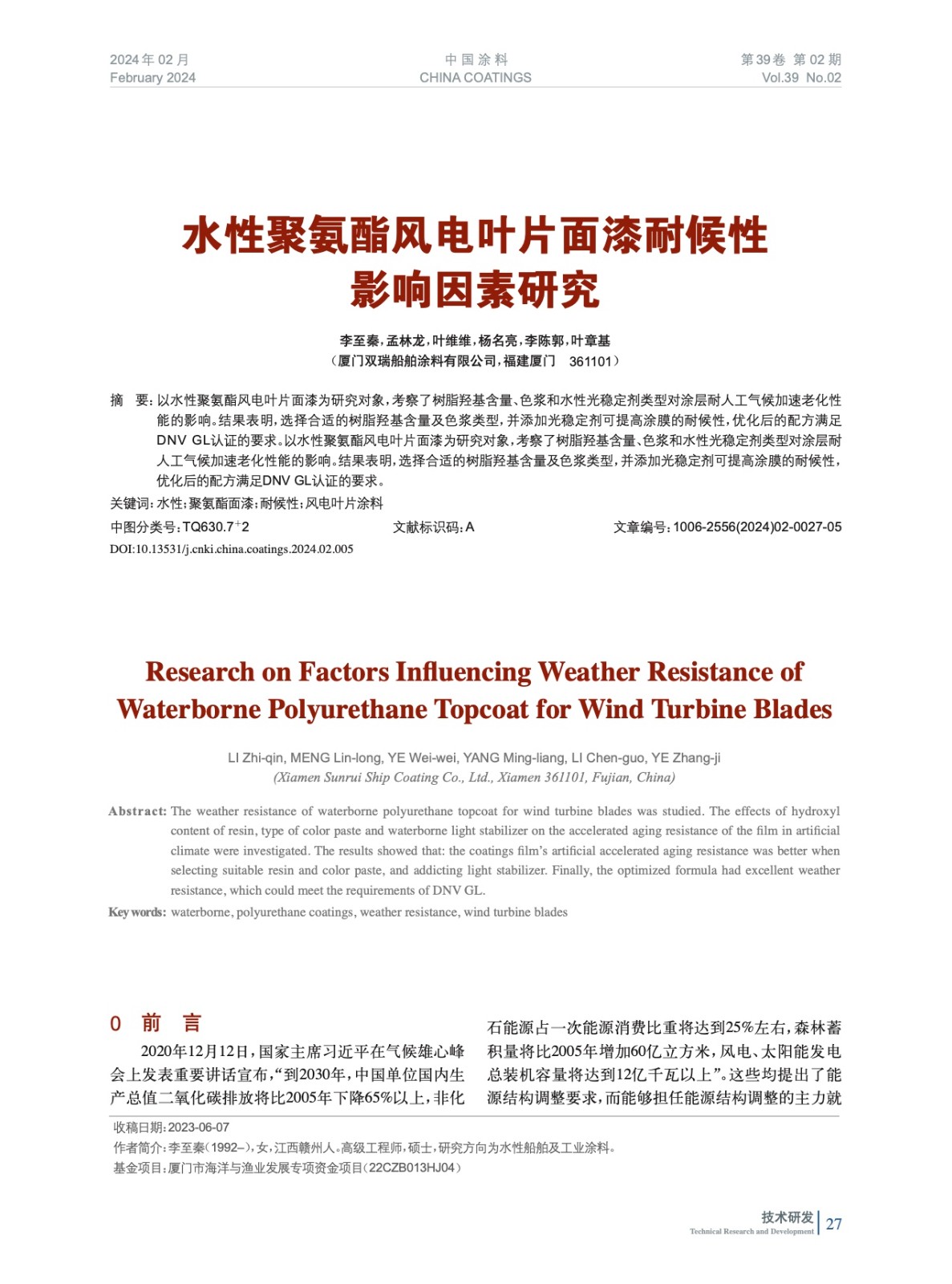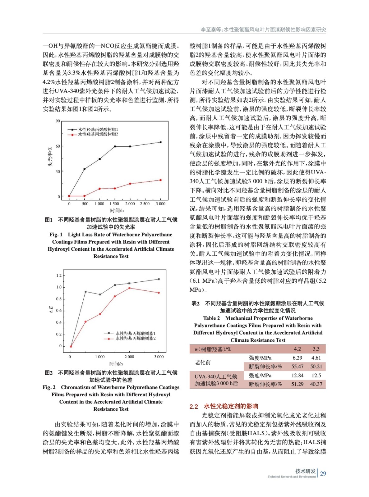 水性聚氨酯風電葉片面漆耐候性影響因素研究