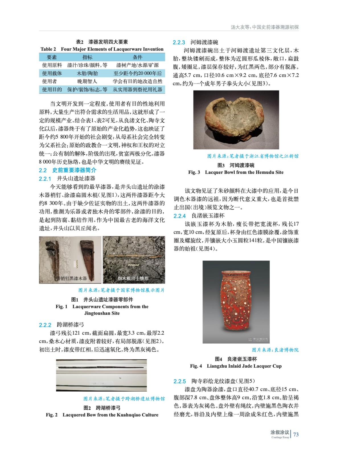 展示了史前漆器的出土概況,提出了漆器發明的四大要素,對史前重要漆器文物進行簡介,分析論證史前用漆文獻材料,最后對史前漆器做了綜述總結。