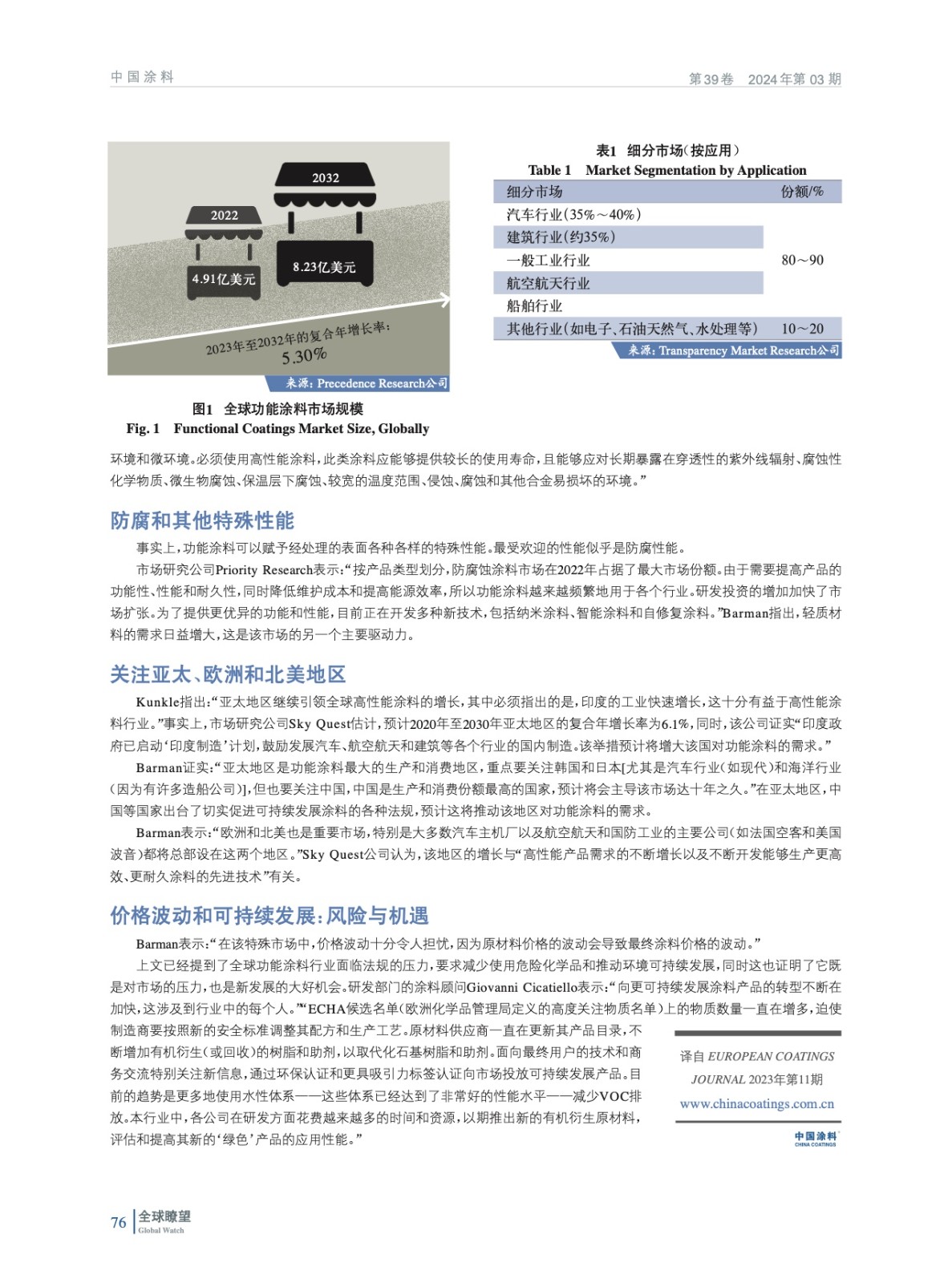 編者按:防護涂料、防污涂料和殺菌涂料、自修復涂料和超親水性涂料、導電涂料、變色和示溫涂料……功能涂料領域非常多樣化,但是,由于行業以及終端消費者對它們的需求不斷增大,每個細分市場都越來越受歡迎。