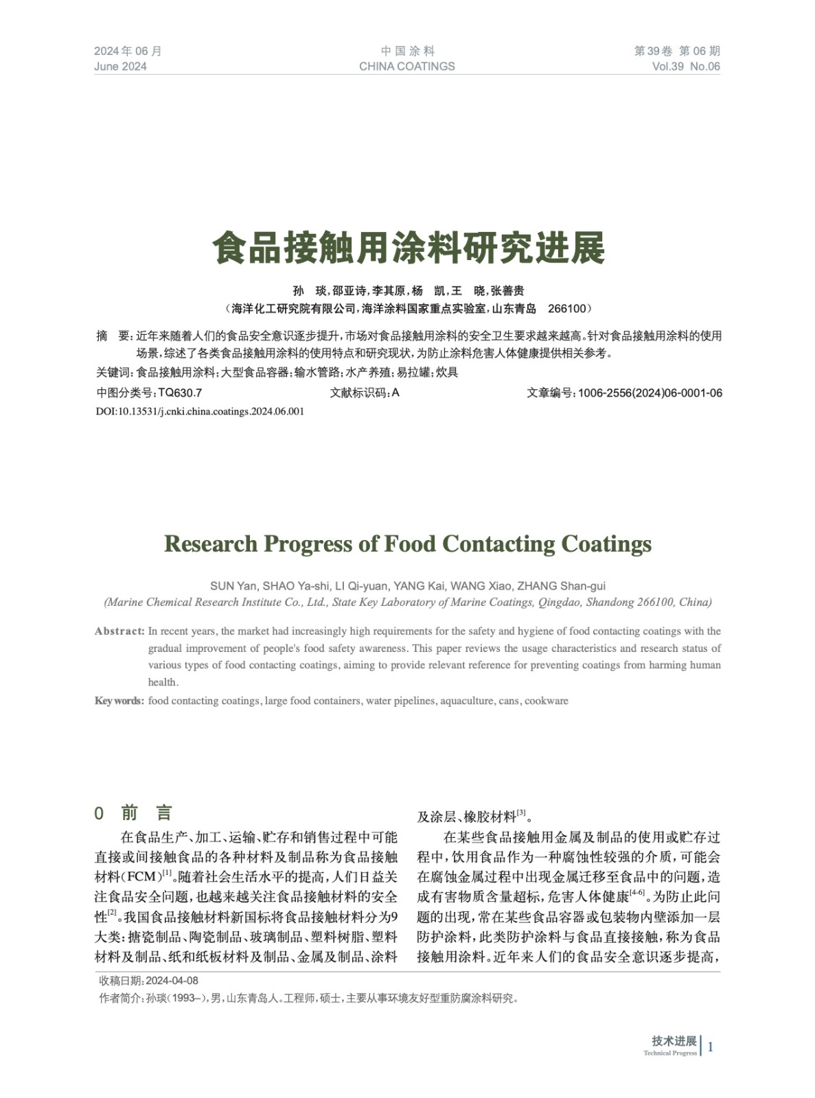 摘要:近年來隨著人們的食品安全意識逐步提升,市場對食品接觸用涂料的安全衛(wèi)生要求越來越高。針對食品接觸用涂料的使用場景,綜述了各類食品接觸用涂料的使用特點和研究現(xiàn)狀,為防止涂料危害人體健康提供相關參考。