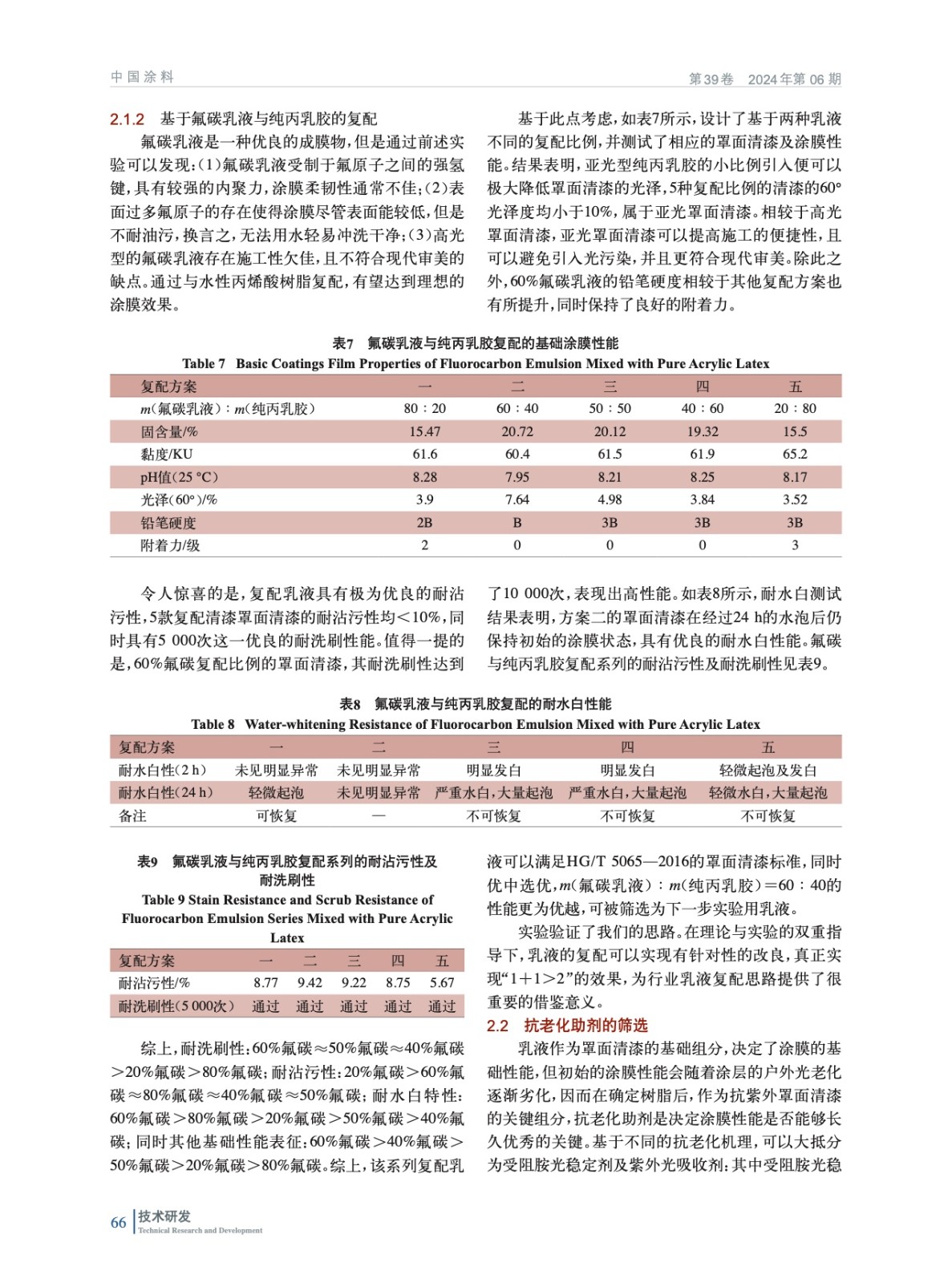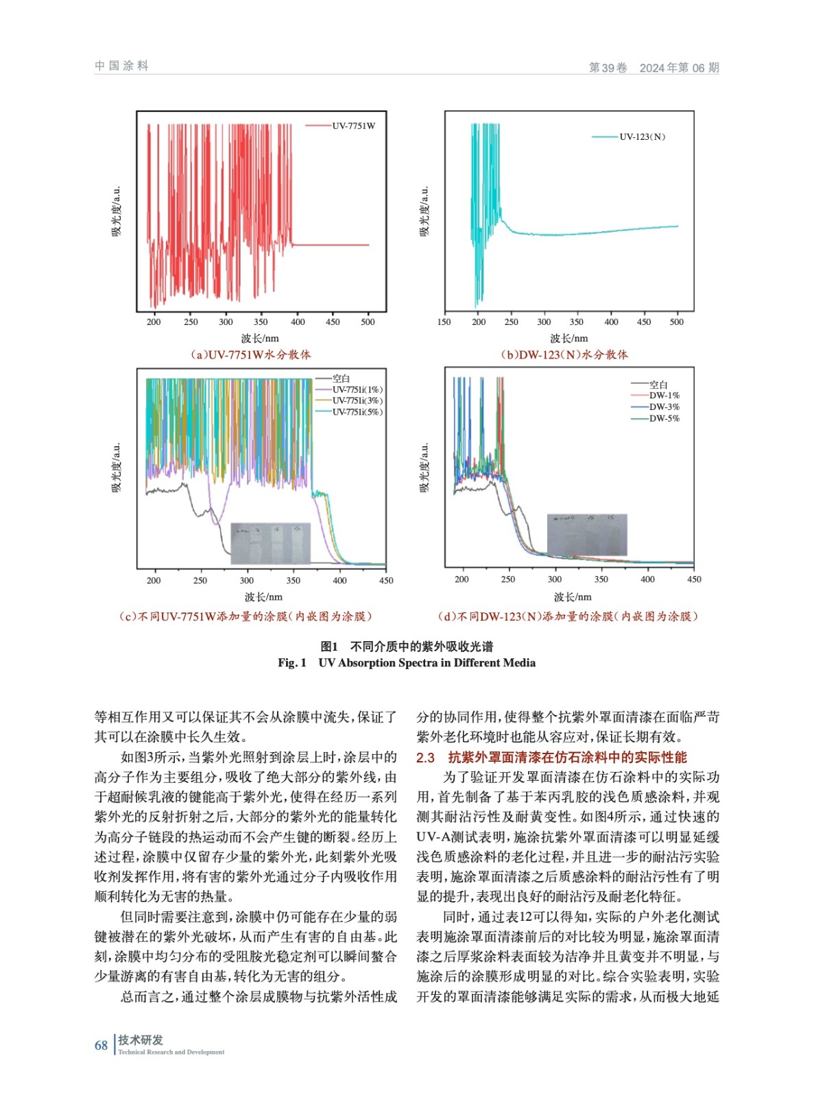 摘要:開發(fā)一款具有耐老化性能的罩面清漆,不僅可以起到屏蔽紫外線的功效,而且方便施工,具有極佳的便捷性與適用性。實驗結(jié)果表明,實驗開發(fā)的罩面清漆具有優(yōu)異的耐老化性能,涂層整體抗老化性能的明顯提升,紫外吸收光譜表明,UV-7751W相較于DW-123(N)在紫外波段有更寬泛的響應區(qū)間,表現(xiàn)出更良好的抗紫外老化性能,且復配紫外光吸收劑性能更優(yōu),其他基礎涂膜性能如耐沾污性(<10%)和耐洗刷性(>10 000次)遠超標準,這對于長久地保持建筑物清潔自然,延長建筑物的翻新周期,節(jié)約自然資源至關(guān)重要,符合新時代的發(fā)展要求。