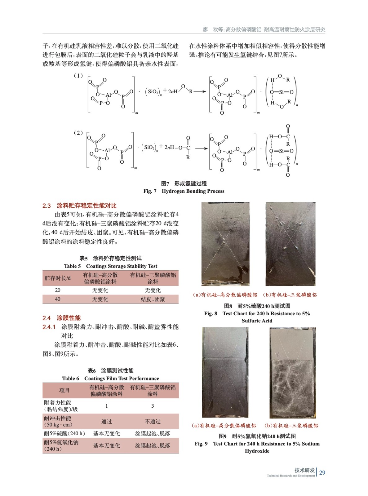 摘要:研究了一種高分散偏磷酸鋁–耐高溫耐腐蝕防火涂層,使用二氧化硅包膜對偏磷酸鋁進行表面改性,并用SEM測試包膜后的粒子表面形貌,用刮板細度計以及粒徑分析儀測試分散性;將硅包膜的偏磷酸鋁應用在有機硅樹脂中,與三聚磷酸鋁進行對比,測試涂料的穩定性以及涂膜的各項性能。結果表明,硅包膜后的偏磷酸鋁表面形貌發生了改變,形成0.5~5 μm的球狀顆粒,在有機硅乳液中的漿料平均粒徑為3.46 μm,對比未包膜的偏磷酸鋁在有機硅乳液中的漿料平均粒徑為44.61 μm,硅包膜后的偏磷酸鋁具備高分散性;在有機硅–高分散偏磷酸鋁涂料中,涂料貯存40 d無變化,黏結強度為1級,涂膜耐5%硫酸以及5%氫氧化鈉240 h,耐鹽霧200 h,耐鹽霧測試前后,涂膜進行1 200~1 400 ℃高溫噴火測試60 s無變化,鋼板背溫分別為485 ℃和538 ℃;高分散偏磷酸鋁增強了體系的穩定性、耐酸堿性能、防高溫性能以及耐鹽霧性能;制成高分散偏磷酸鋁–聚磷酸銨–聚醋酸乙烯酯涂料,涂層噴火1 min,炭層膨脹40倍以上;預計此方案可應用在鋼結構的耐高溫耐腐蝕防火涂層中。