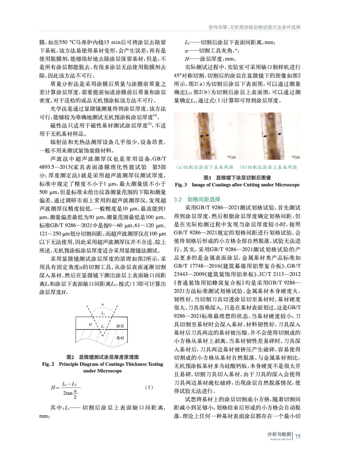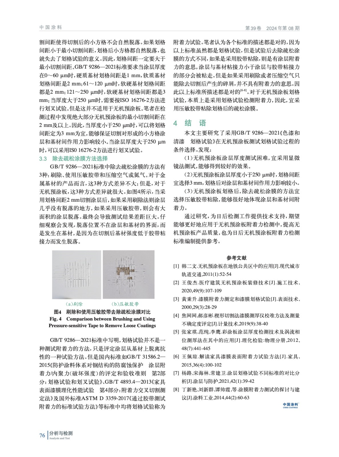 摘要:主要研究采用GB/T 9286—2021《色漆和清漆 劃格試驗》在無機預涂板測試劃格試驗過程中的條件選擇。調研國內外標準并結合實際試驗,為無機預涂板測試劃格試驗尋找合適的試驗條件。結果表明:無機預涂板涂層厚度宜采用顯微鏡法測試;當涂層厚度小于250 μm時,劃格間距宜選擇3 mm;除去疏松涂膜的方法宜選擇壓敏膠帶粘除。