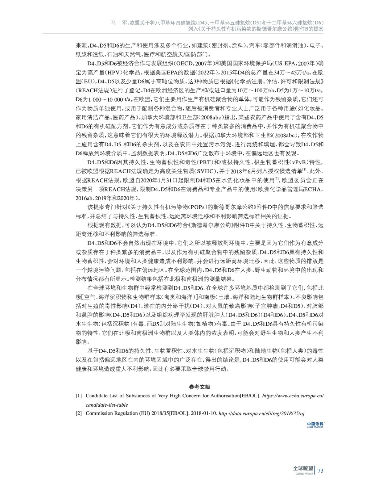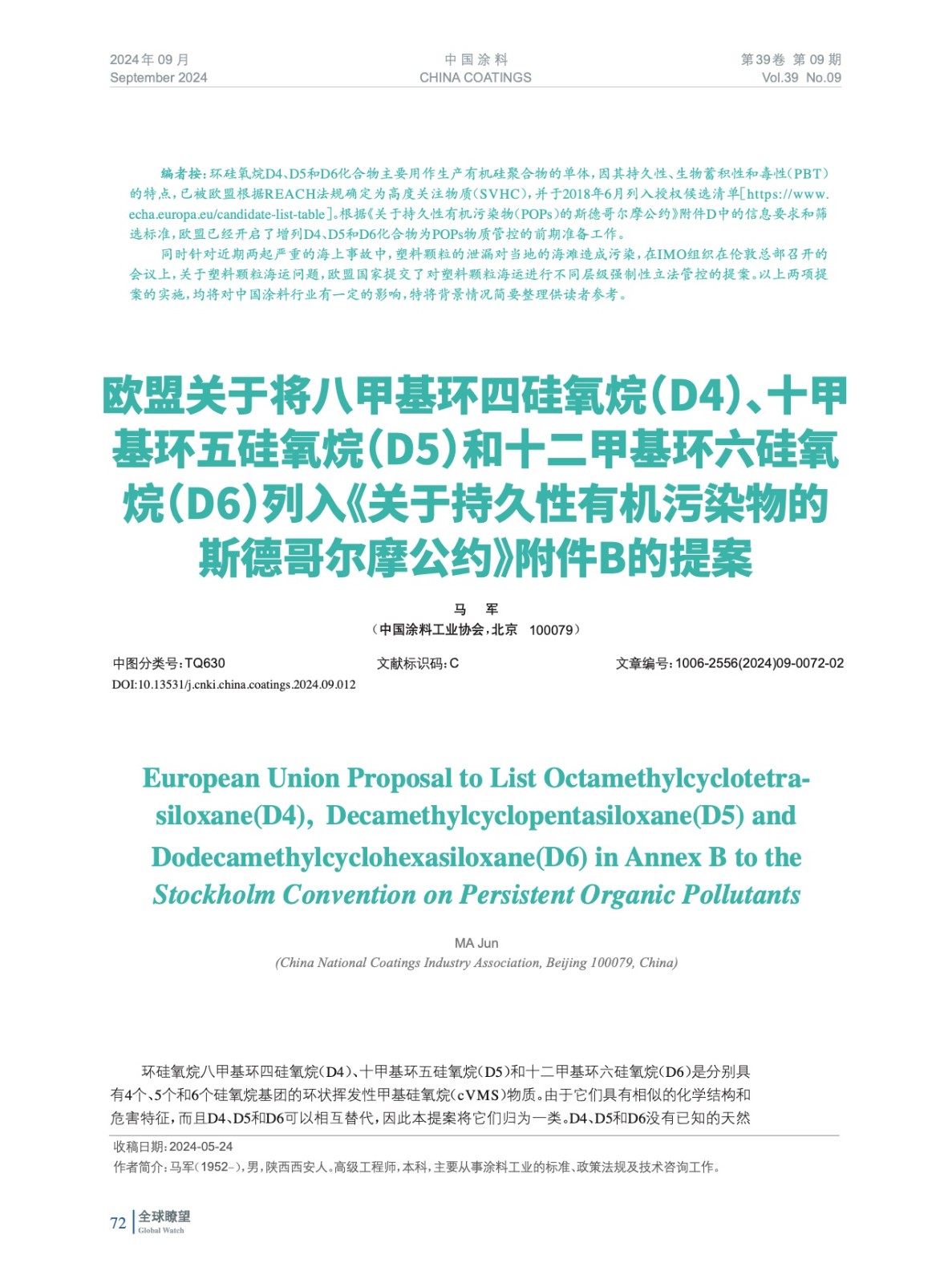 歐盟關(guān)于將八甲基環(huán)四硅氧烷(D4)、十甲基環(huán)五硅氧烷(D5)和十二甲基環(huán)六硅氧烷(D6)列入《關(guān)于持久性有機(jī)污染物的斯德哥爾摩公約》附件B的提案