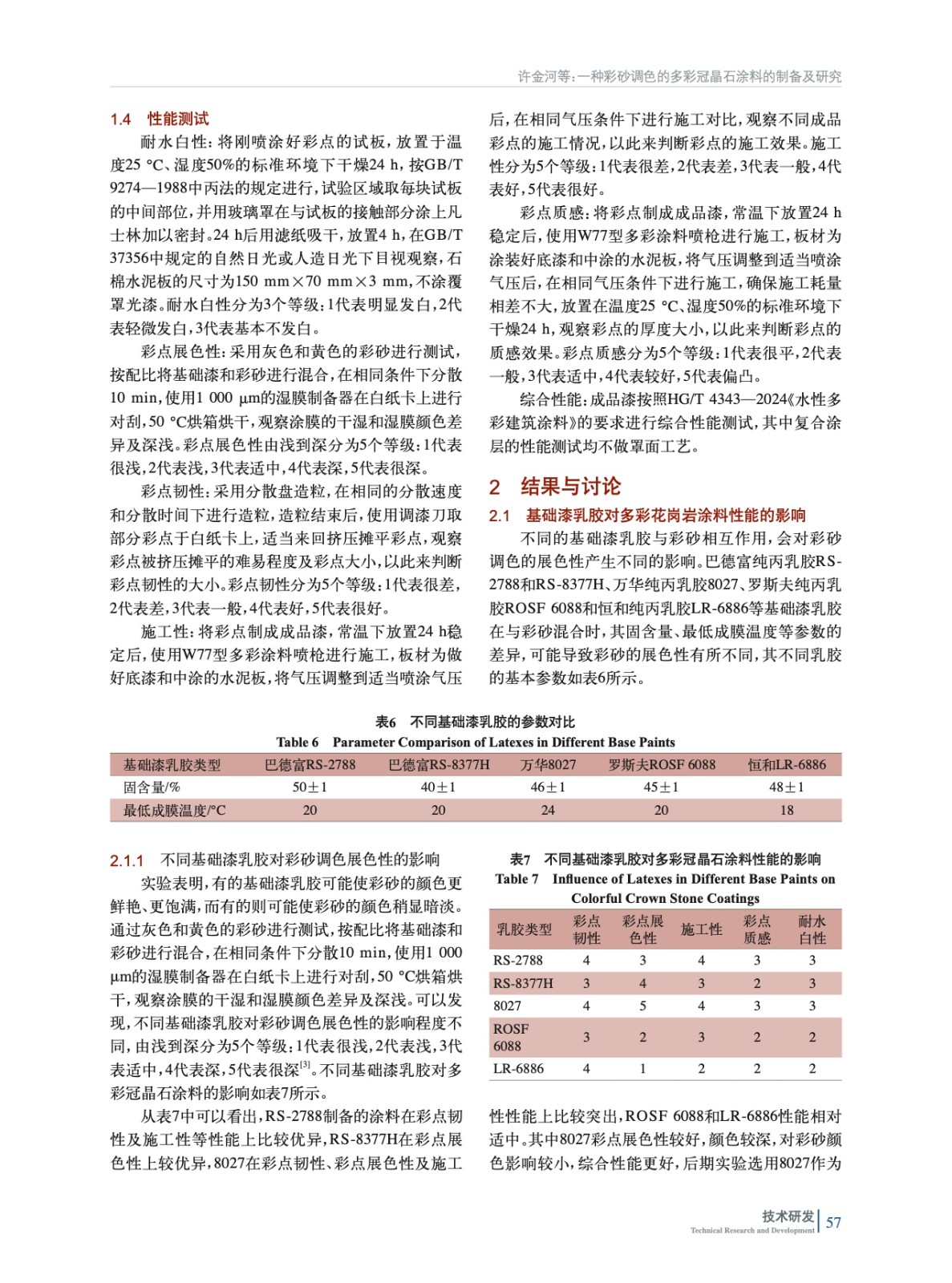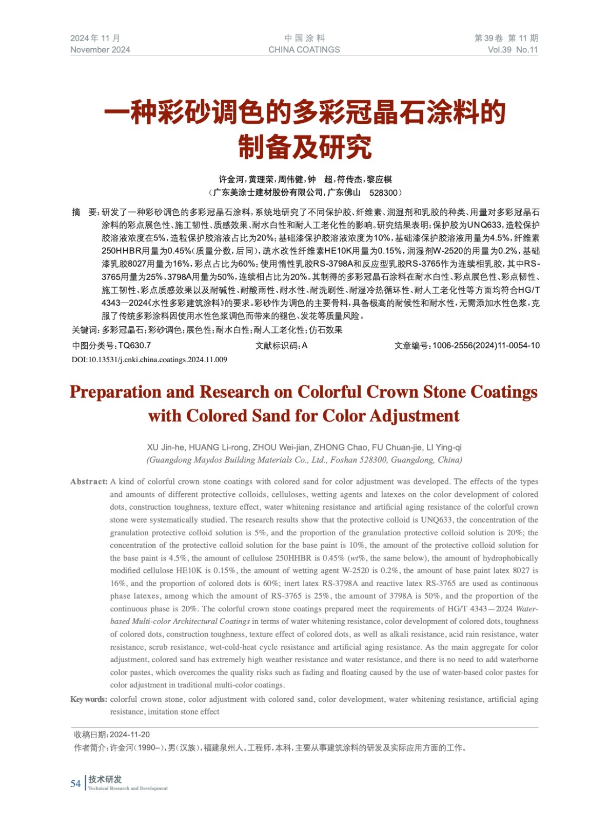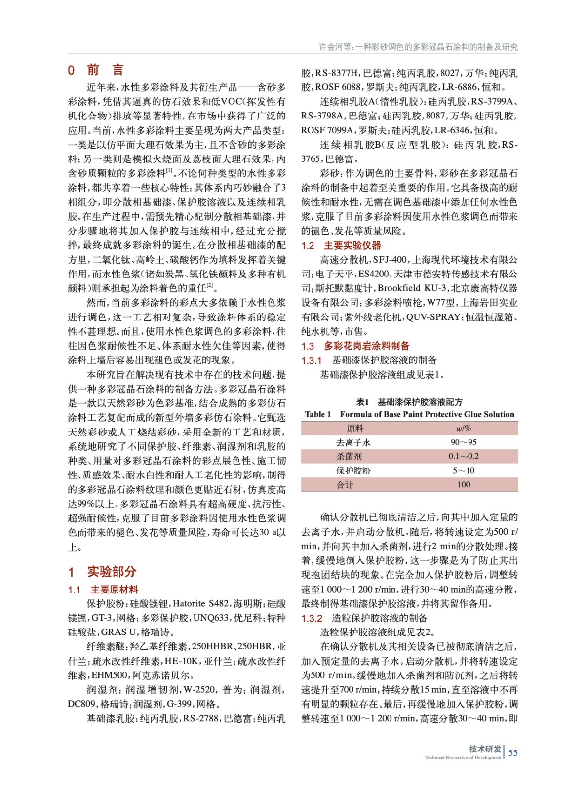 摘要:研發(fā)了一種彩砂調(diào)色的多彩冠晶石涂料,系統(tǒng)地研究了不同保護(hù)膠、纖維素、潤濕劑和乳膠的種類、用量對多彩冠晶石涂料的彩點展色性、施工韌性、質(zhì)感效果、耐水白性和耐人工老化性的影響。研究結(jié)果表明:保護(hù)膠為UNQ633,造粒保護(hù)膠溶液濃度在5%,造粒保護(hù)膠溶液占比為20%;基礎(chǔ)漆保護(hù)膠溶液濃度為10%,基礎(chǔ)漆保護(hù)膠溶液用量為4.5%,纖維素250HHBR用量為0.45%(質(zhì)量分?jǐn)?shù),后同),疏水改性纖維素HE10K用量為0.15%,潤濕劑W-2520的用量為0.2%,基礎(chǔ)漆乳膠8027用量為16%,彩點占比為60%;使用惰性乳膠RS-3798A和反應(yīng)型乳膠RS-3765作為連續(xù)相乳膠,其中RS-3765用量為25%、3798A用量為50%,連續(xù)相占比為20%。其制得的多彩冠晶石涂料在耐水白性、彩點展色性、彩點韌性、施工韌性、彩點質(zhì)感效果以及耐堿性、耐酸雨性、耐水性、耐洗刷性、耐濕冷熱循環(huán)性、耐人工老化性等方面均符合HG/T 4343—2024《水性多彩建筑涂料》的要求。彩砂作為調(diào)色的主要骨料,具備極高的耐候性和耐水性,無需添加水性色漿,克服了傳統(tǒng)多彩涂料因使用水性色漿調(diào)色而帶來的褪色、發(fā)花等質(zhì)量風(fēng)險。