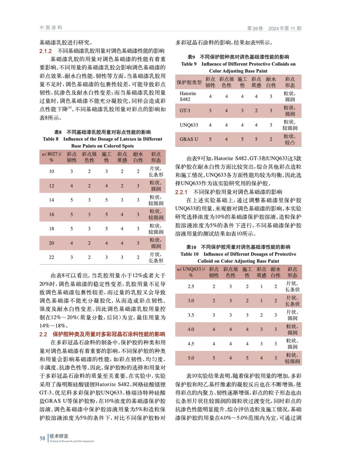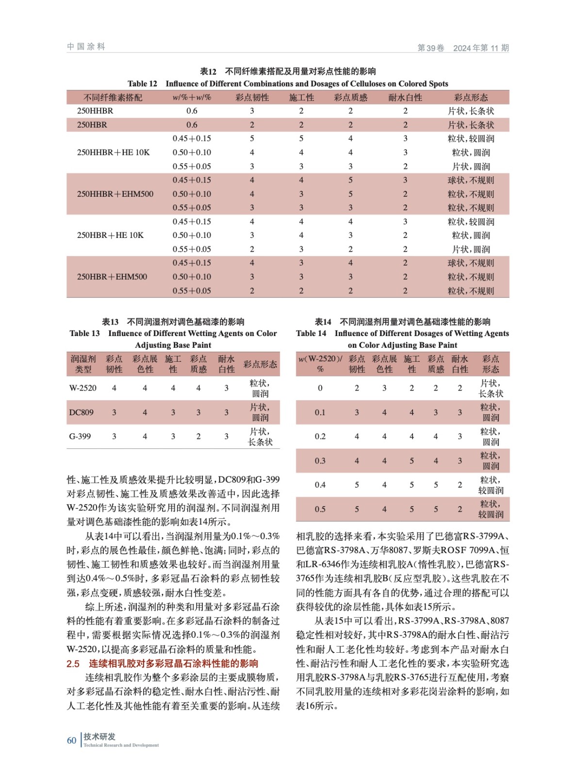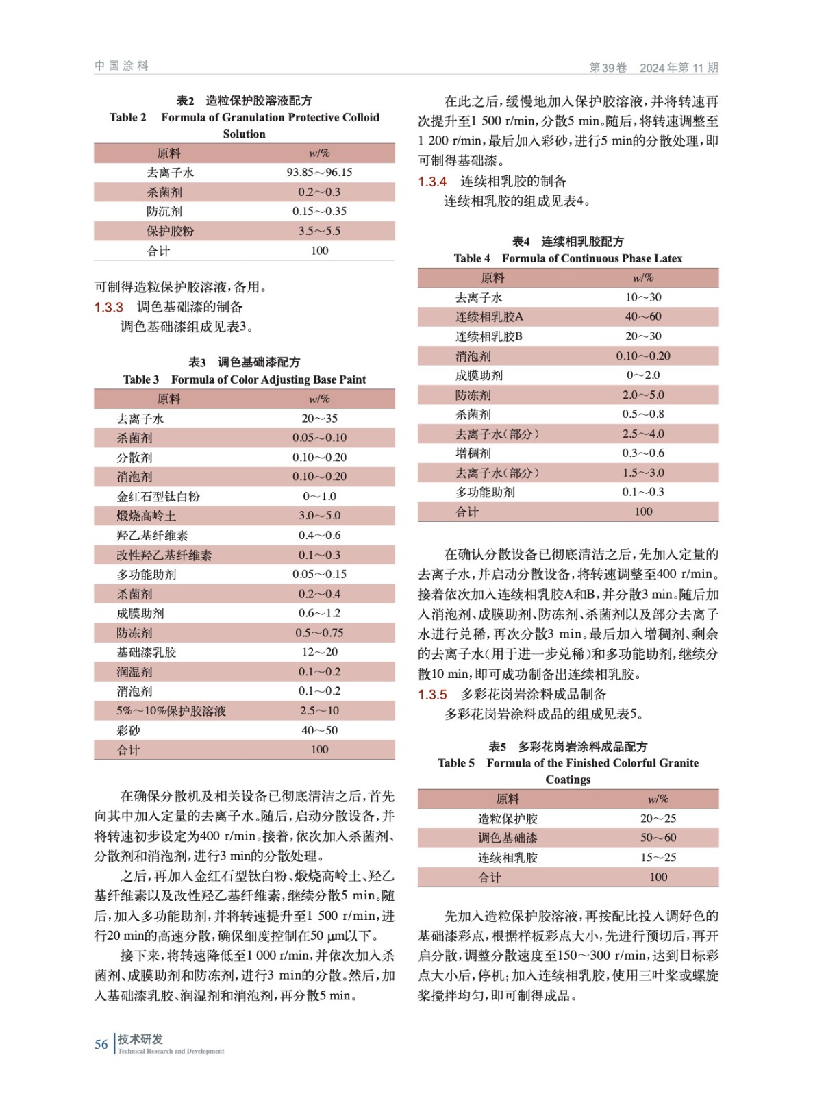 摘要:研發(fā)了一種彩砂調(diào)色的多彩冠晶石涂料,系統(tǒng)地研究了不同保護(hù)膠、纖維素、潤濕劑和乳膠的種類、用量對多彩冠晶石涂料的彩點展色性、施工韌性、質(zhì)感效果、耐水白性和耐人工老化性的影響。研究結(jié)果表明:保護(hù)膠為UNQ633,造粒保護(hù)膠溶液濃度在5%,造粒保護(hù)膠溶液占比為20%;基礎(chǔ)漆保護(hù)膠溶液濃度為10%,基礎(chǔ)漆保護(hù)膠溶液用量為4.5%,纖維素250HHBR用量為0.45%(質(zhì)量分?jǐn)?shù),后同),疏水改性纖維素HE10K用量為0.15%,潤濕劑W-2520的用量為0.2%,基礎(chǔ)漆乳膠8027用量為16%,彩點占比為60%;使用惰性乳膠RS-3798A和反應(yīng)型乳膠RS-3765作為連續(xù)相乳膠,其中RS-3765用量為25%、3798A用量為50%,連續(xù)相占比為20%。其制得的多彩冠晶石涂料在耐水白性、彩點展色性、彩點韌性、施工韌性、彩點質(zhì)感效果以及耐堿性、耐酸雨性、耐水性、耐洗刷性、耐濕冷熱循環(huán)性、耐人工老化性等方面均符合HG/T 4343—2024《水性多彩建筑涂料》的要求。彩砂作為調(diào)色的主要骨料,具備極高的耐候性和耐水性,無需添加水性色漿,克服了傳統(tǒng)多彩涂料因使用水性色漿調(diào)色而帶來的褪色、發(fā)花等質(zhì)量風(fēng)險。