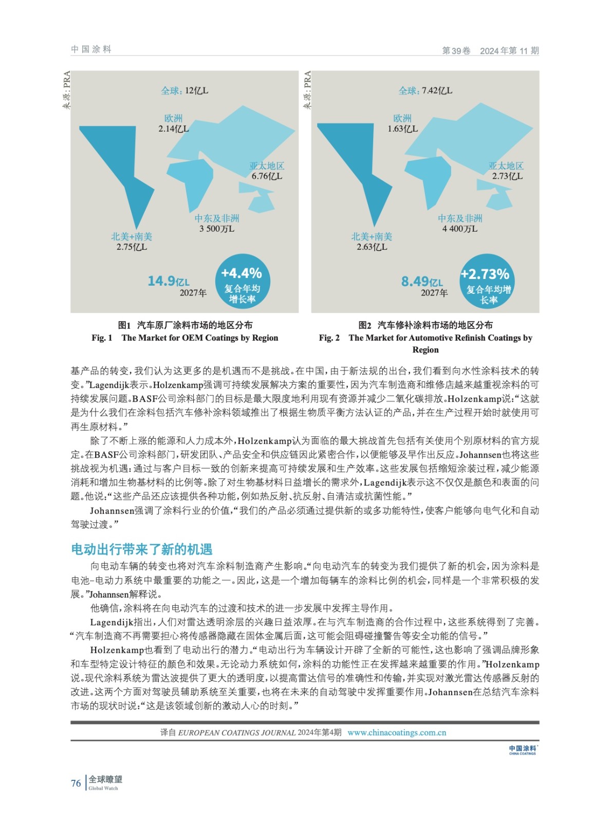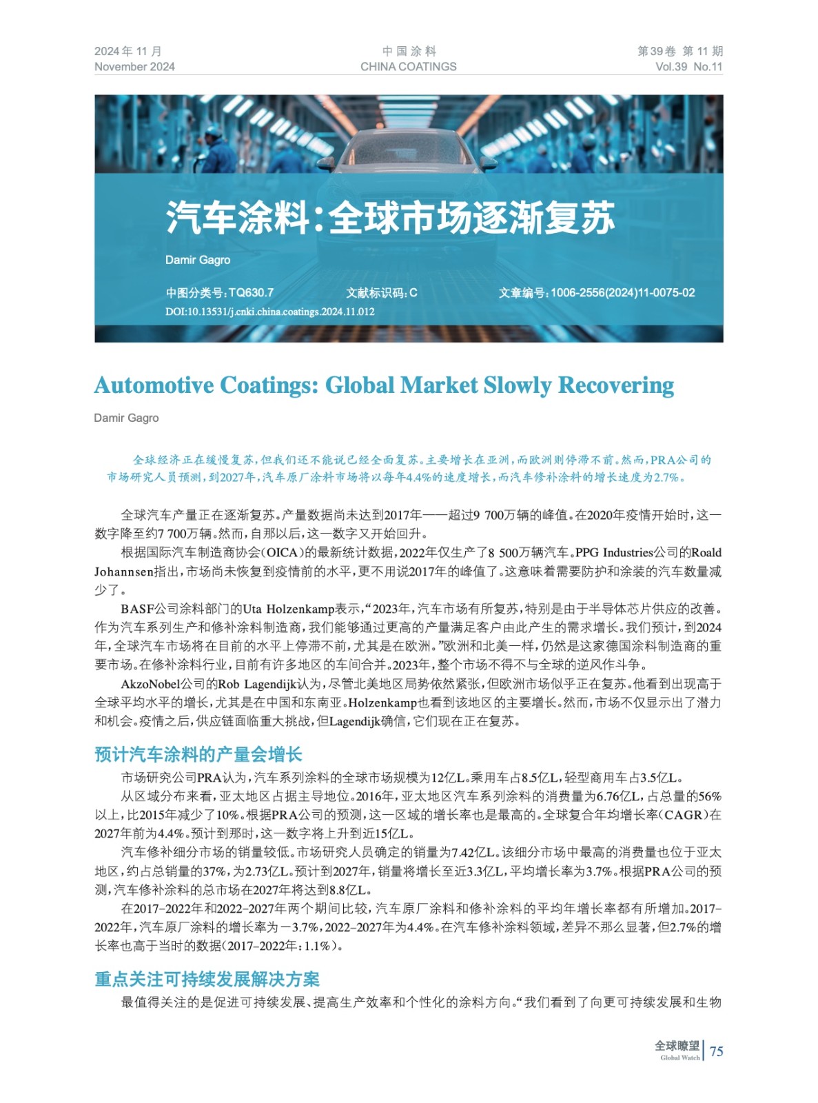 摘要:編者按:全球經(jīng)濟(jì)正在緩慢復(fù)蘇,但我們還不能說(shuō)已經(jīng)全面復(fù)蘇。主要增長(zhǎng)在亞洲,而歐洲則停滯不前。然而,PRA公司的市場(chǎng)研究人員預(yù)測(cè),到2027年,汽車(chē)原廠涂料市場(chǎng)將以每年4.4%的速度增長(zhǎng),而汽車(chē)修補(bǔ)涂料的增長(zhǎng)速度為2.7%。