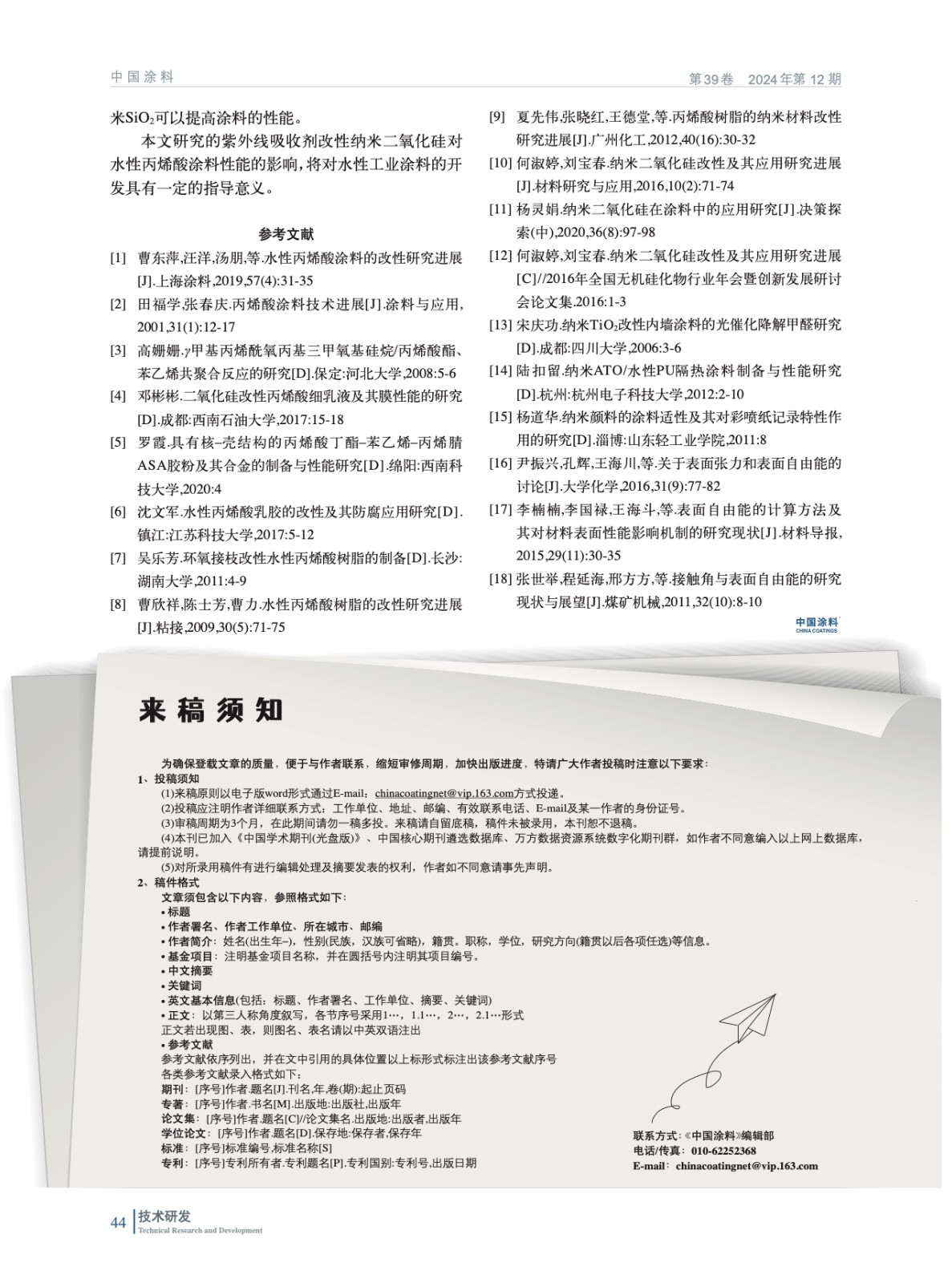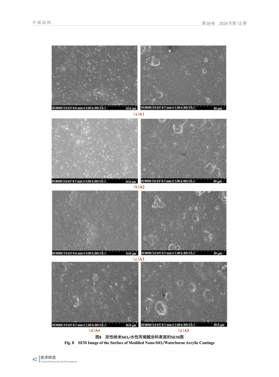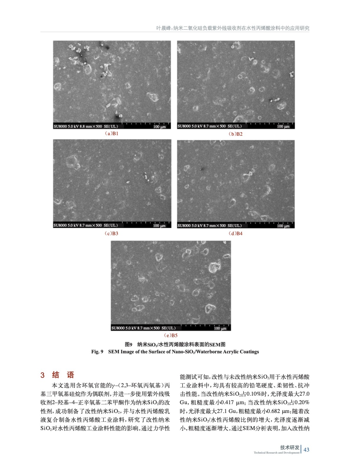 摘要:研究旨在制備負載紫外線的納米二氧化硅(SiO2)改性的水性丙烯酸工業涂料,并研究改性納米SiO2含量對涂料性能的影響。采用了接觸角儀、掃描電鏡、常規物理機械性能等對多種手段對涂膜進行表征。研究結果表明,隨著改性納米SiO2含量的增加,涂層具有較好的常規物理機械性能,并且光澤度有所提高。這表明,改性納米SiO2對涂料的增韌和增強效果顯著,能夠改善涂層的常規物理機械性能和表面性能。然而,當改性納米SiO2含量達到一定值時,增加含量并不能繼續提高涂層的光澤度,甚至會導致涂層表面性能變差。這是因為,改性納米SiO2在涂層中的分散度和填充效果受到含量的影響,達到一定含量后,納米SiO2顆粒之間的互相聚集和堆積現象會加劇,使涂層的表面質量受到損害。