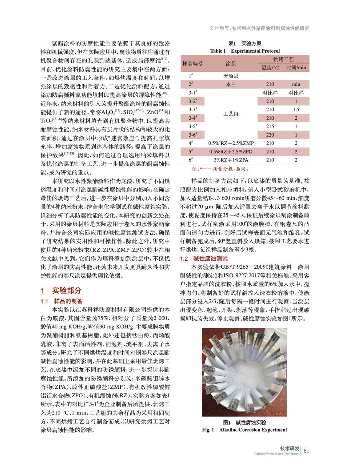 摘要:以水性聚酯涂料為底漆,研究了不同烘烤工藝對涂層耐堿性腐蝕的影響。在確定最佳烘烤工藝(210 ℃、2 min)后,實驗加入了多磷酸鉬鋅水合物(ZPA)、改性正磷酸鹽(ZMP)、有機改性磷酸鋅鋁鉬水合物(ZPO)、有機緩蝕劑(RZ)4種納米粉末,結合電化學測試和堿性腐蝕實驗,評估其對涂層耐腐蝕性能的影響。實驗結果表明,加入納米粉末后,涂層的耐腐蝕性能顯著提升,尤其是添加0.5%(質量分數,后同)RZ+2.5%ZPO的涂層表現出最佳的電化學耐腐蝕性能。該研究為開發(fā)高性能卷尺用聚酯涂層提供了有效的理論依據與實驗支持。