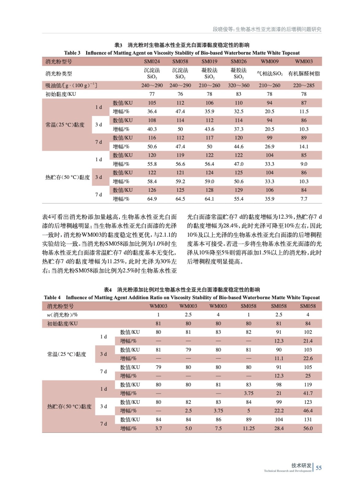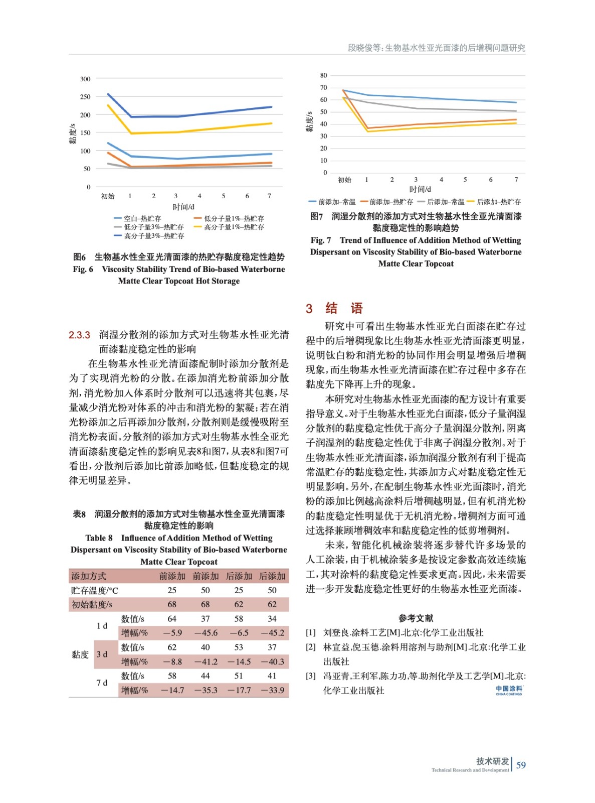 摘要:分析了消光粉、增稠劑、分散劑的種類和添加比例以及分散劑的添加方式對生物基水性亞光面漆黏度穩定性的影響規律。研究表明,生物基水性亞光白面漆在貯存過程中的后增稠現象比生物基水性亞光清面漆更明顯,說明鈦白粉和消光粉的協同作用會明顯增強后增稠現象,而生物基水性亞光清面漆在貯存過程中多存在黏度先下降再上升的現象。高溫貯存會加速其后增稠;消光粉添加比例越高后增稠越明顯;采用高剪、中剪和低剪增稠劑配制的生物基水性亞光白面漆一定程度上的后增稠程度依次提高,但有些低剪增稠劑兼顧增稠效率和黏度穩定性的優勢。低分子量潤濕分散劑的黏度穩定性優于高分子量潤濕分散劑,陰離子潤濕劑的黏度穩定性優于非離子潤濕分散劑。