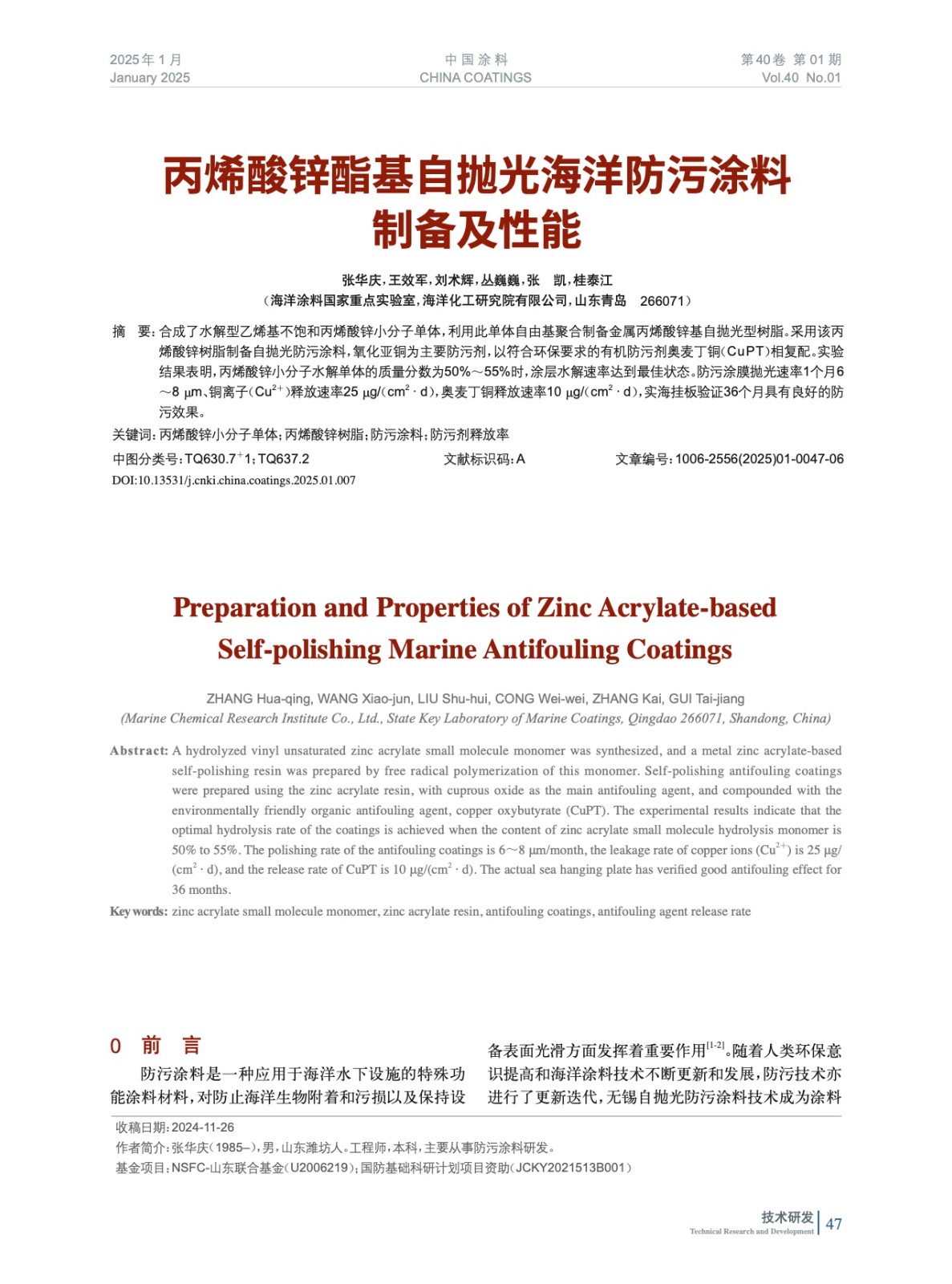 摘要:合成了水解型乙烯基不飽和丙烯酸鋅小分子單體,利用此單體自由基聚合制備金屬丙烯酸鋅基自拋光型樹脂。采用該丙烯酸鋅樹脂制備自拋光防污涂料,氧化亞銅為主要防污劑,以符合環(huán)保要求的有機(jī)防污劑奧麥丁銅(CuPT)相復(fù)配。實(shí)驗(yàn)結(jié)果表明,丙烯酸鋅小分子水解單體的質(zhì)量分?jǐn)?shù)為50%~55%時(shí),涂層水解速率達(dá)到最佳狀態(tài)。防污涂膜拋光速率1個(gè)月6~8 μm、銅離子(Cu2+)釋放速率25 μg/(cm2·d),奧麥丁銅釋放速率10 μg/(cm2·d),實(shí)海掛板驗(yàn)證36個(gè)月具有良好的防污效果。