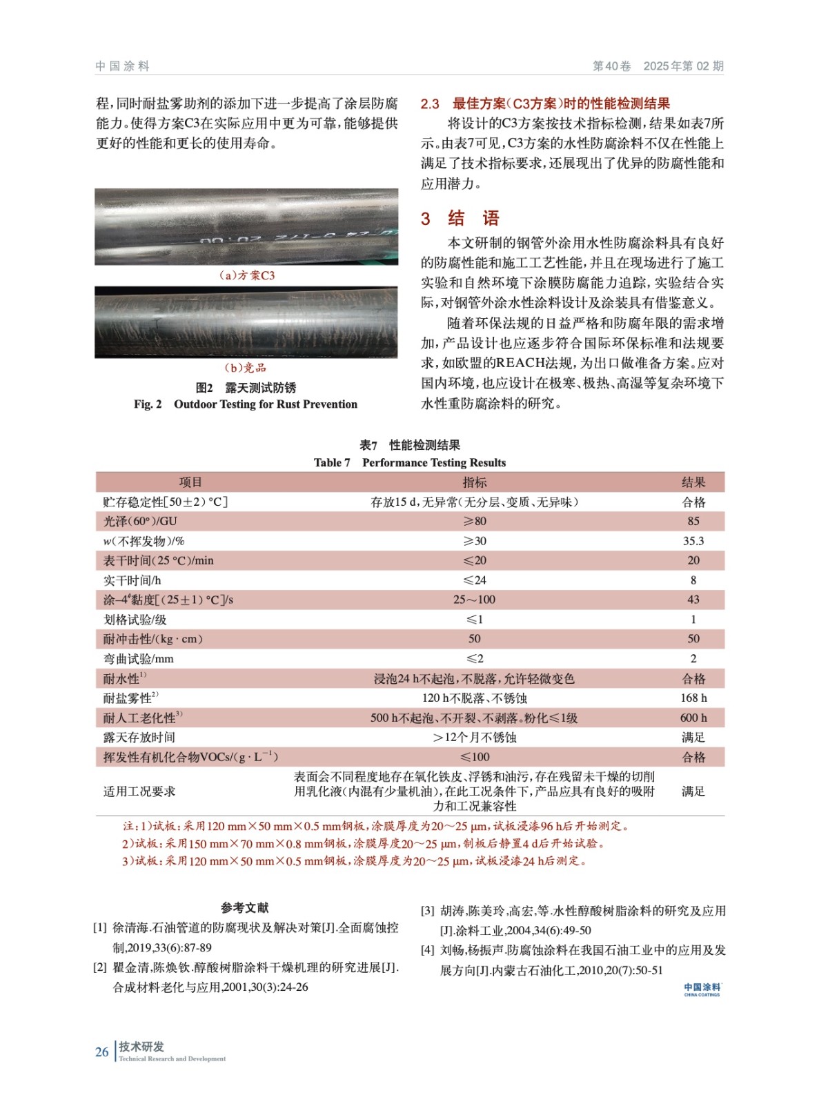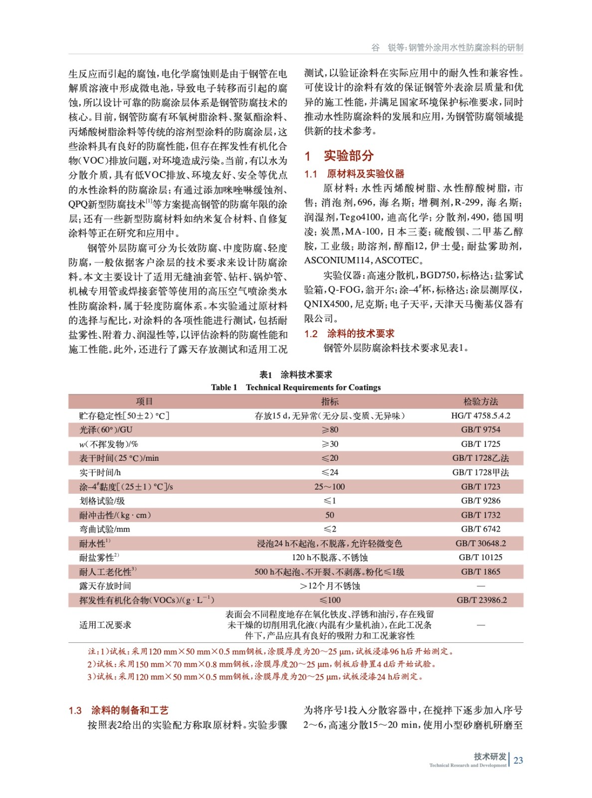 摘要:研制了一種適用于鋼管外涂的水性輕防腐涂料,并對其技術要求進行了介紹。先通過樹脂類型的表干時間對比確定了使用主要成膜物質為水性丙烯酸樹脂,然后通過改變水性丙烯酸樹脂和耐鹽霧助劑在配方中的添加量,評估其對涂膜耐鹽霧性能的影響,并測試了切削液對涂膜潤濕性、附著力的影響。研究結果表明,方案C3滿足技術要求,且在鋼管上殘留未干燥的切削用乳化液的施工條件下,表現出良好的吸附力、工況兼容性和防腐能力。