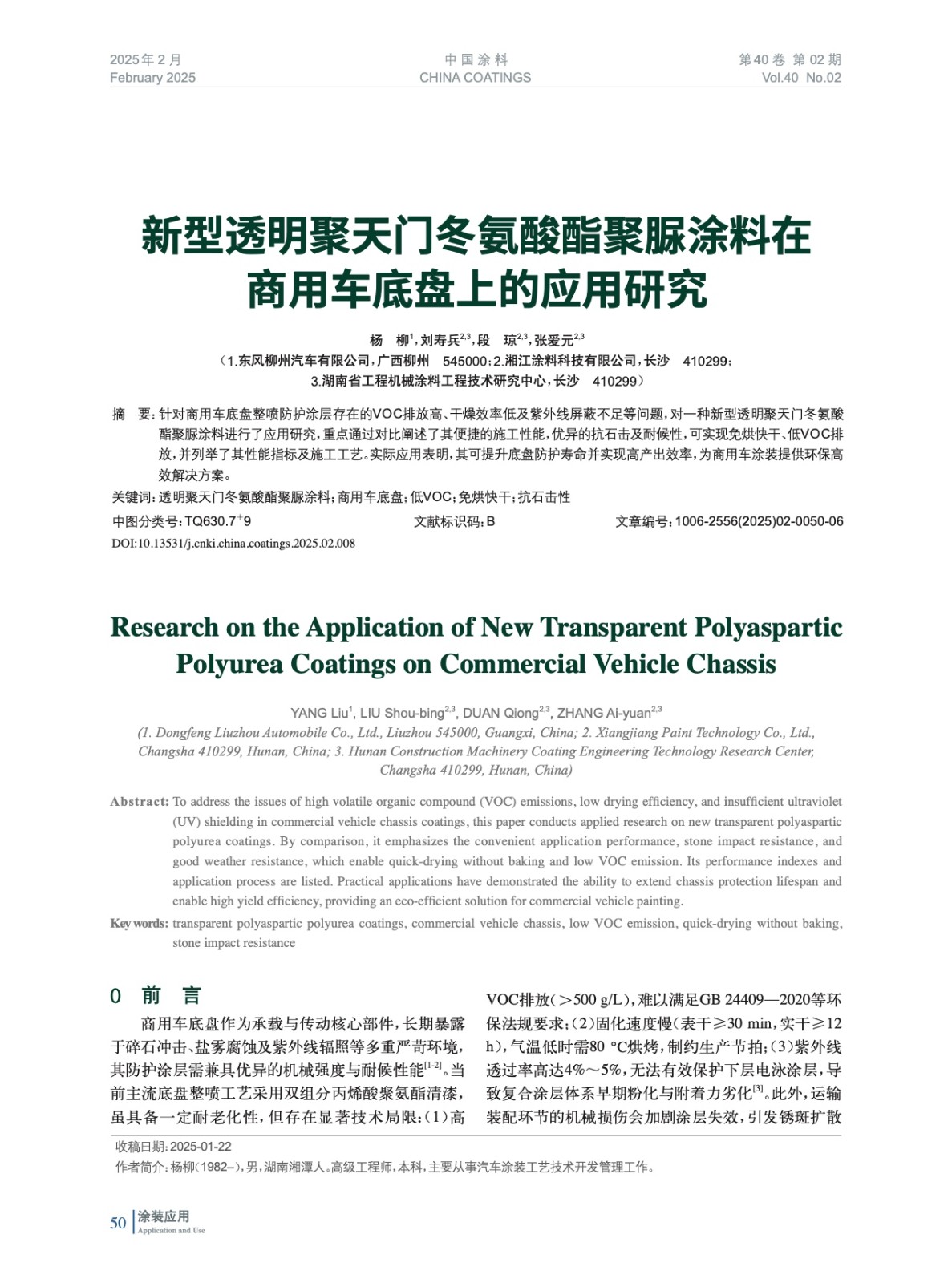 摘要:針對(duì)商用車(chē)底盤(pán)整噴防護(hù)涂層存在的VOC排放高、干燥效率低及紫外線(xiàn)屏蔽不足等問(wèn)題,對(duì)一種新型透明聚天門(mén)冬氨酸酯聚脲涂料進(jìn)行了應(yīng)用研究,重點(diǎn)通過(guò)對(duì)比闡述了其便捷的施工性能,優(yōu)異的抗石擊及耐候性,可實(shí)現(xiàn)免烘快干、低VOC排放,并列舉了其性能指標(biāo)及施工工藝。實(shí)際應(yīng)用表明,其可提升底盤(pán)防護(hù)壽命并實(shí)現(xiàn)高產(chǎn)出效率,為商用車(chē)涂裝提供環(huán)保高效解決方案。