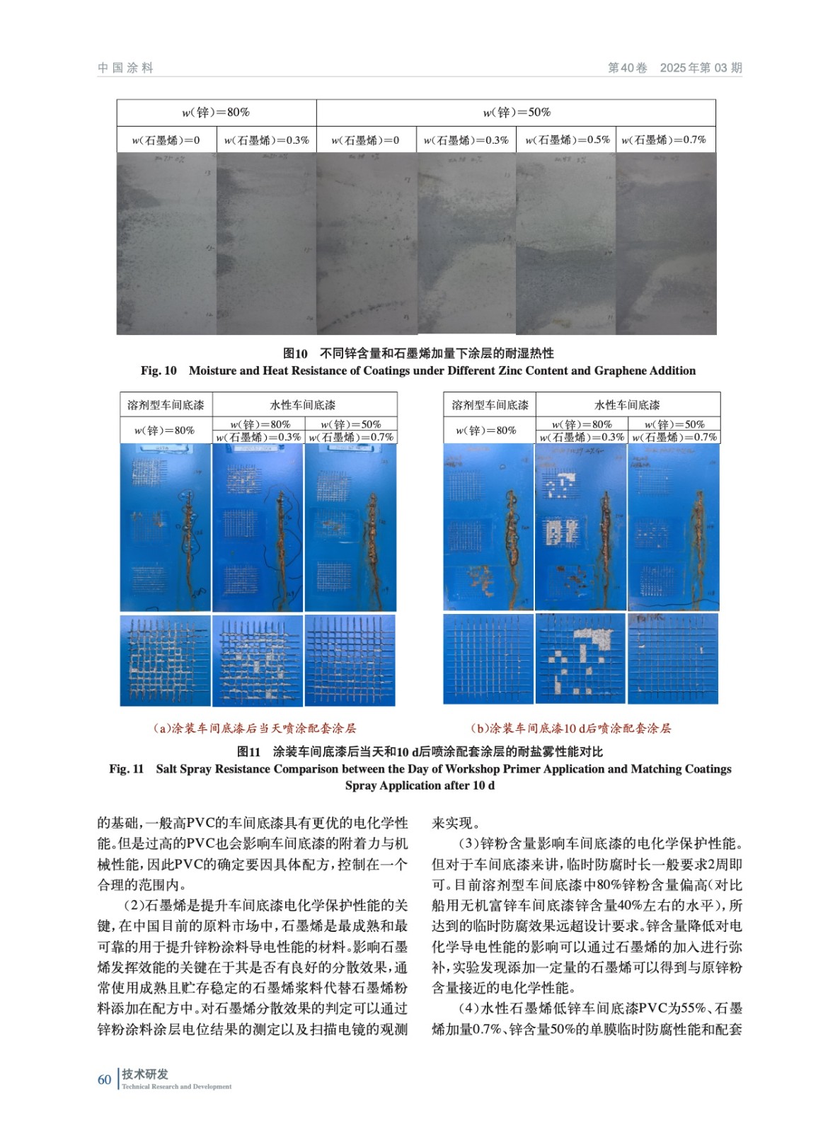 摘要:研制一款用于集裝箱的水性石墨烯低鋅車間底漆,使其性能與溶劑型車間底漆相當,并具有明顯的環境友好優勢。通過減少鋅含量的方法降低有害氣體濃度,保護人體健康安全。鋅含量降低導致電化學性能下降的問題,可通過調整鋅粉漆顏料體積濃度(PVC),同時添加一定量石墨烯的方法加以改善,使最終性能接近溶劑型車間底漆的水平,并滿足其臨時防腐的設計要求。將鋅粉漆配方的PVC調整至55%,鋅粉含量調整至50%(質量分數,后同),石墨烯加量0.7%,得到的車間底漆涂層的電極電位小于-0.8 V,經過35 ℃濕熱環境2周的測試,沒有出現銹蝕現象,通過了臨時防腐性能的測試要求。其配套涂層的耐鹽霧性能與溶劑型車間底漆相當,加速線擴蝕速度明顯減緩。在滿足其設計要求的基礎上實現了保護環境和人體健康安全的目的。