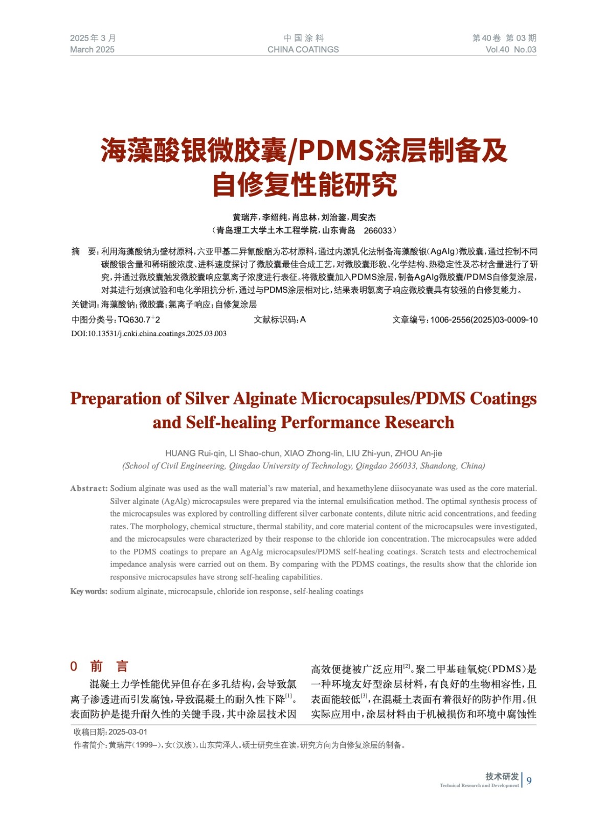 海藻酸銀微膠囊/PDMS涂層制備及自修復性能研究